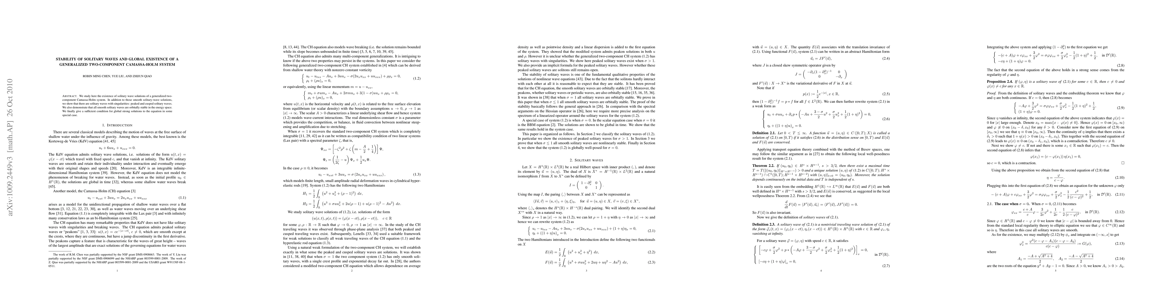 This paper investigates solitary wave solutions for a generalized two-component Camassa-Holm system, identifying both smooth and singular types, such as peaked and cusped waves. It concludes that all smooth solitary waves are orbitally stable and provides a condition for global strong solutions.