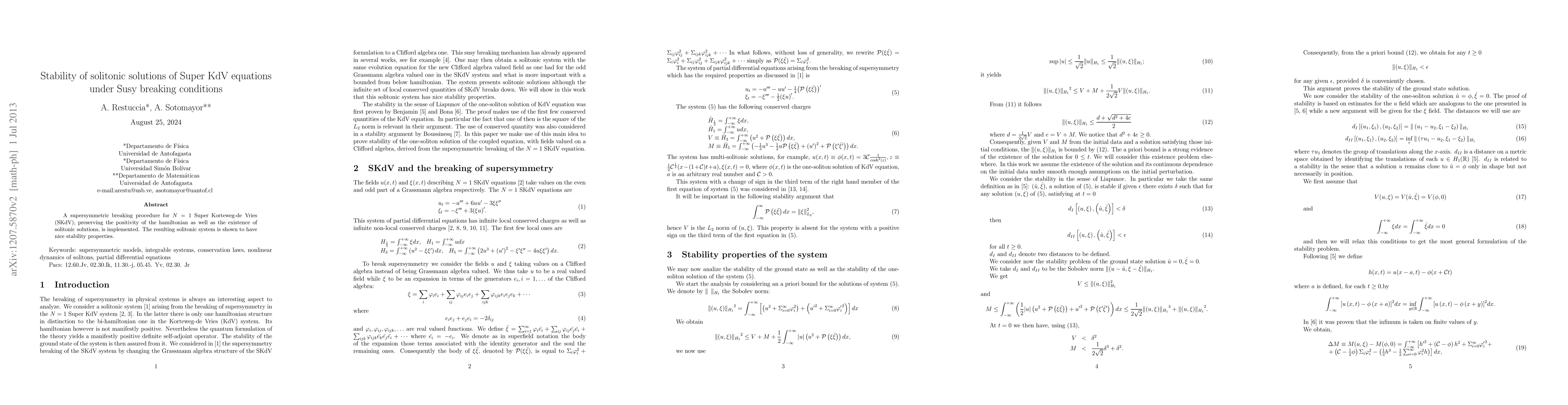 Summary: This paper investigates the stability of solitonic solutions in N=1 Super KdV equations under supersymmetric breaking conditions, demonstrating that the procedure preserves Hamiltonian positivity and maintains stability properties of the integrable system.