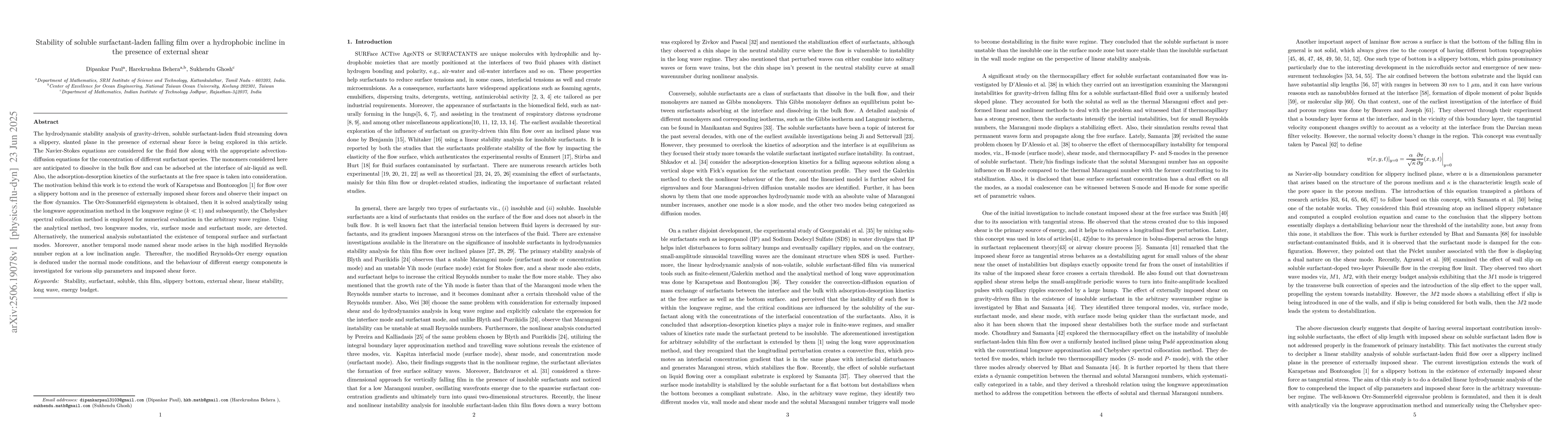 The hydrodynamic stability analysis of gravity-driven, soluble surfactant-laden fluid streaming down a slippery, slanted plane in the presence of external shear force is being explored in this article. The Navier-Stokes equations are considered for the fluid flow along with the appropriate advection-diffusion equations for the concentration of different surfactant species. The monomers considered here are anticipated to dissolve in the bulk flow and can be adsorbed at the interface of air-liquid as well. Also, the adsorption-desorption kinetics of the surfactants at the free space is taken into consideration. The motivation behind this work is to extend the work of Karapetsas and Bontozoglou[1] for flow over a slippery bottom and in the presence of externally imposed shear forces and observe their impact on the flow dynamics. The Orr-Sommerfeld eigensystem is obtained, then it is solved analytically using the longwave approximation method in the longwave regime ($k \ll 1$) and subsequently, the Chebyshev spectral collocation method is employed for numerical evaluation in the arbitrary wave regime. Using the analytical method, two longwave modes, viz, surface mode and surfactant mode, are detected. Alternatively, the numerical analysis substantiated the existence of temporal surface and surfactant modes. Moreover, another temporal mode named shear mode arises in the high modified Reynolds number region at a low inclination angle. Thereafter, the modified Reynolds-Orr energy equation is deduced under the normal mode conditions, and the behaviour of different energy components is investigated for various slip parameters and imposed shear force.