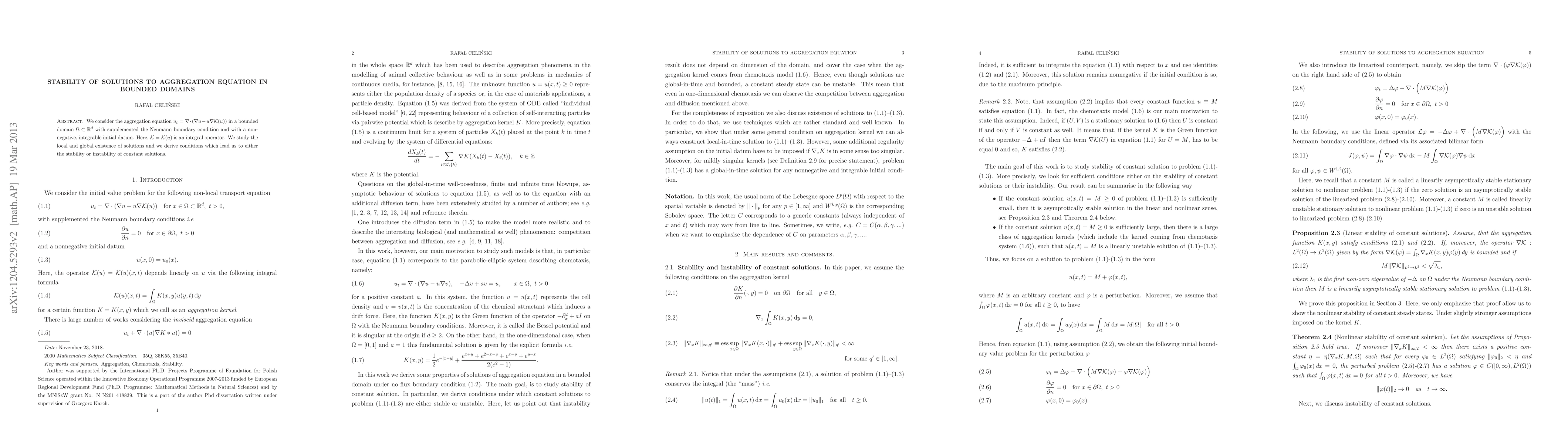 This paper investigates the aggregation equation in bounded domains with Neumann boundary conditions, focusing on the local and global existence of solutions and deriving conditions for the stability or instability of constant solutions.