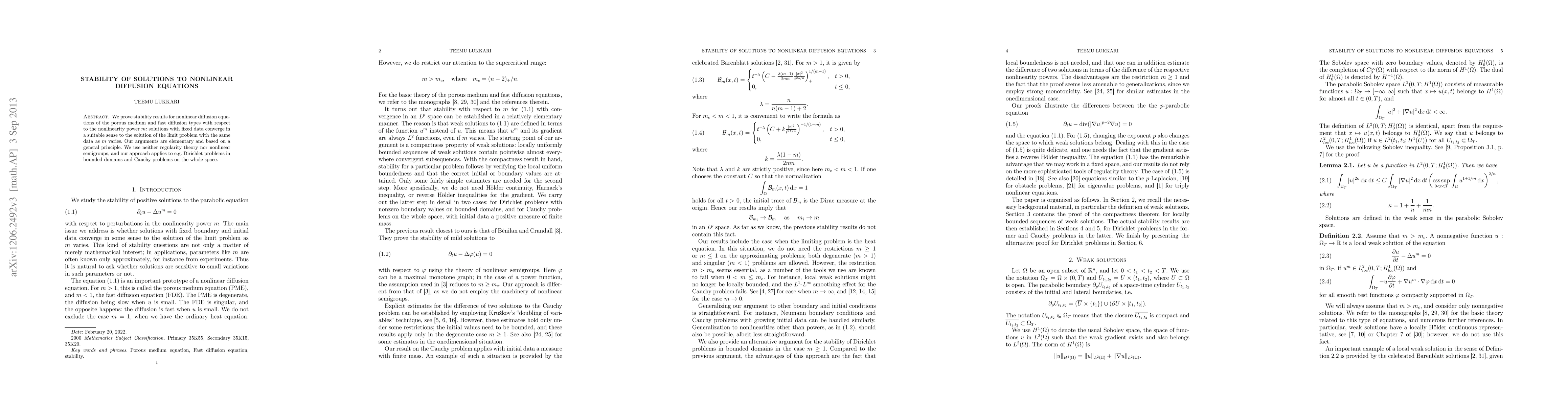 This paper proves stability results for nonlinear diffusion equations, showing that solutions converge to the limit problem as the nonlinearity parameter $m$ varies. The approach is elementary and applicable to various problems without using advanced regularity theory.
