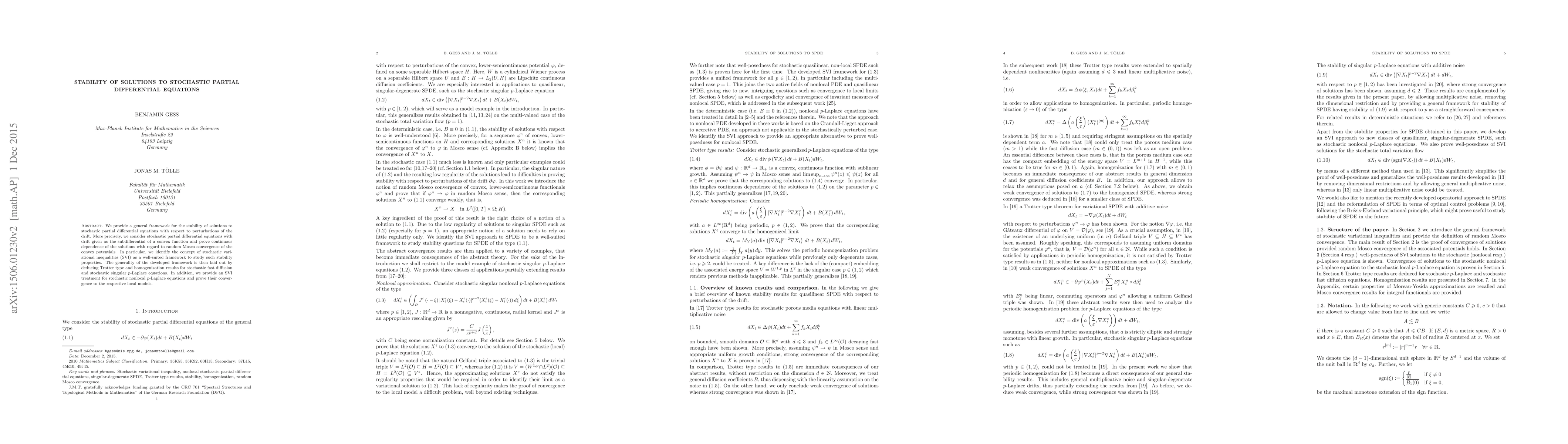 We provide a general framework for the stability of solutions to stochastic partial differential equations with respect to perturbations of the drift. More precisely, we consider stochastic partial differential equations with drift given as the subdifferential of a convex function and prove continuous dependence of the solutions with regard to random Mosco convergence of the convex potentials. In particular, we identify the concept of stochastic variational inequalities (SVI) as a well-suited framework to study such stability properties. The generality of the developed framework is then laid out by deducing Trotter type and homogenization results for stochastic fast diffusion and stochastic singular p-Laplace equations. In addition, we provide an SVI treatment for stochastic nonlocal p-Laplace equations and prove their convergence to the respective local models.