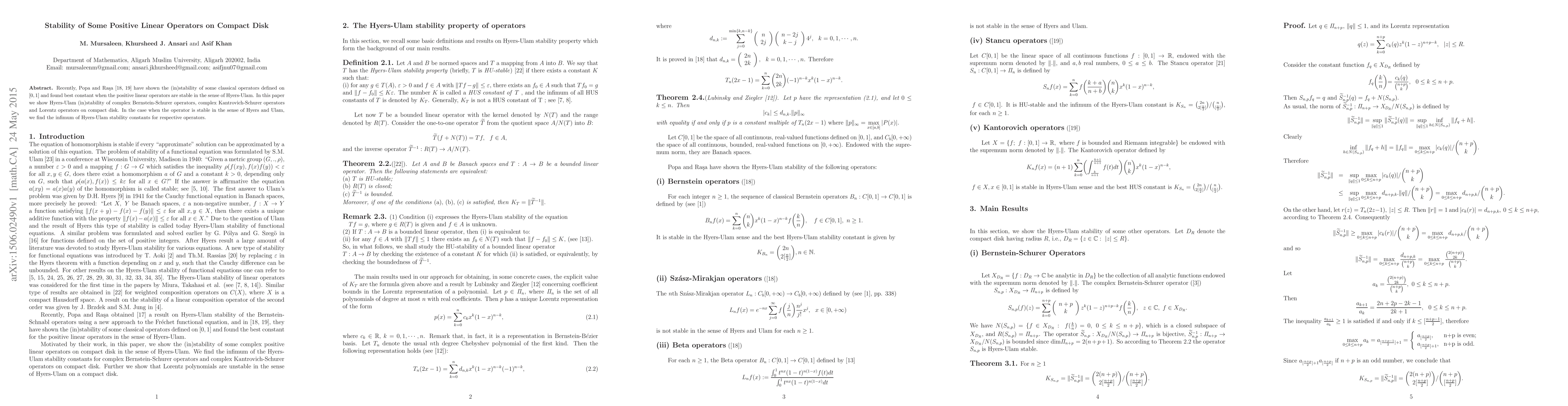 This paper investigates the Hyers-Ulam (in)stability of complex Bernstein-Schurer, complex Kantrovich-Schurer, and Lorentz operators on a compact disk. When stability is found, it determines the infimum of Hyers-Ulam stability constants for these operators.