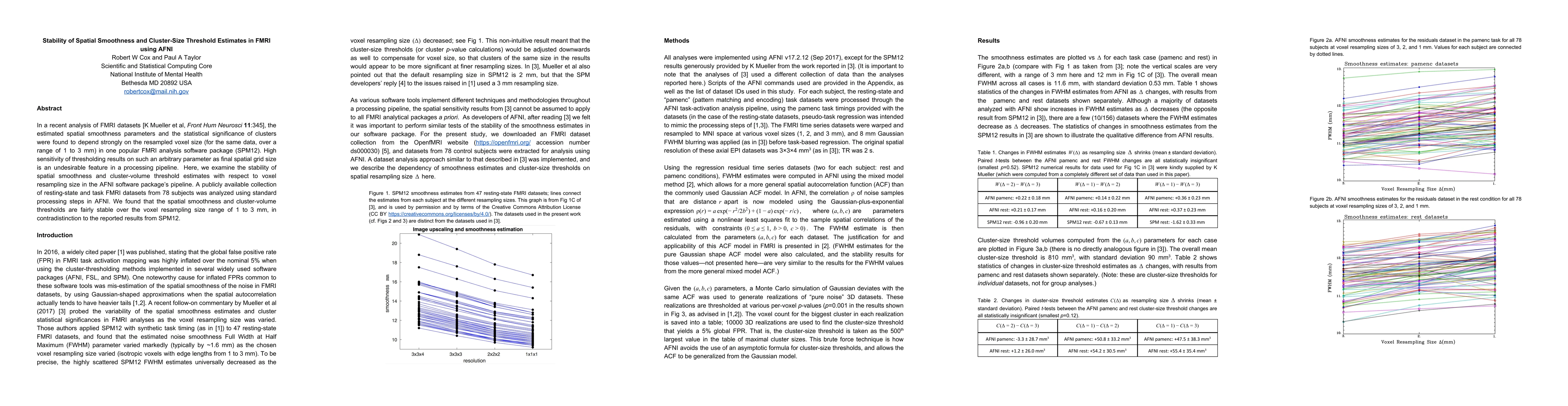 This study investigates the stability of spatial smoothness and cluster-volume threshold estimates in AFNI software for FMRI data, finding that these parameters remain stable over voxel resampling sizes from 1 to 3 mm, unlike the sensitivity observed in SPM12.