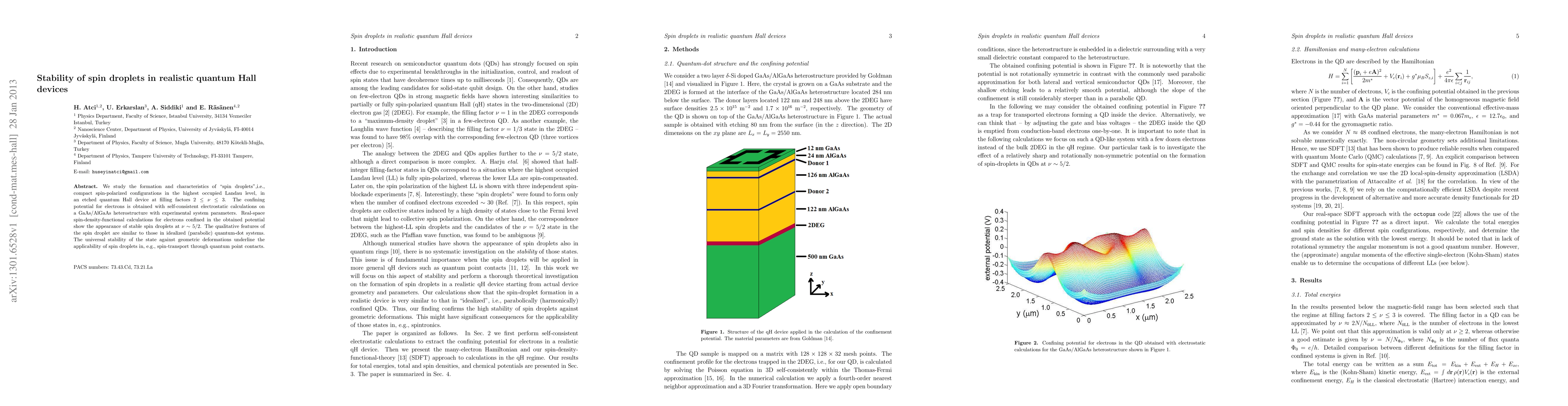This paper investigates the formation and stability of spin droplets in realistic quantum Hall devices, revealing their existence at the $\nu\sim 5/2$ filling factor through self-consistent electrostatic calculations and real-space spin-density-functional theory. The findings suggest these stable spin-polarized configurations could be useful for spin-transport applications.