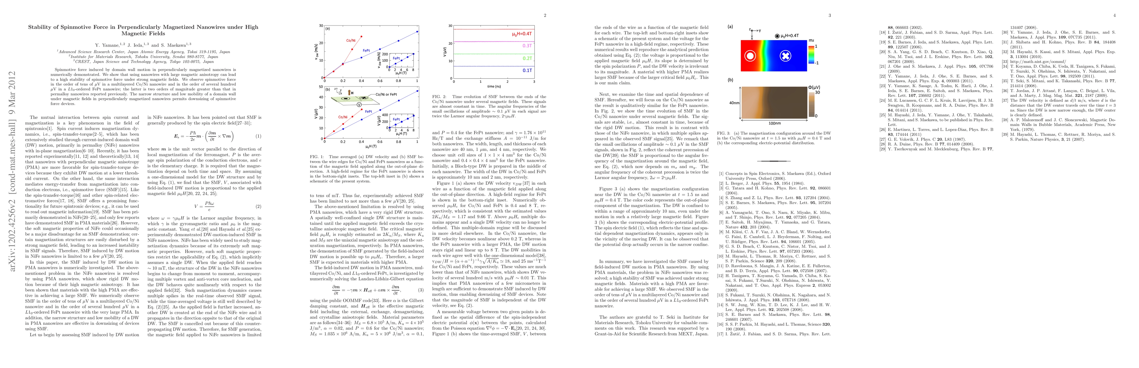 This paper demonstrates numerically that spinmotive force in perpendicularly magnetized nanowires remains stable under high magnetic fields, especially in nanowires with high magnetic anisotropy. FePt nanowires exhibit significantly higher spinmotive force compared to Co/Ni and permalloy nanowires, enabling potential miniaturization of related devices.