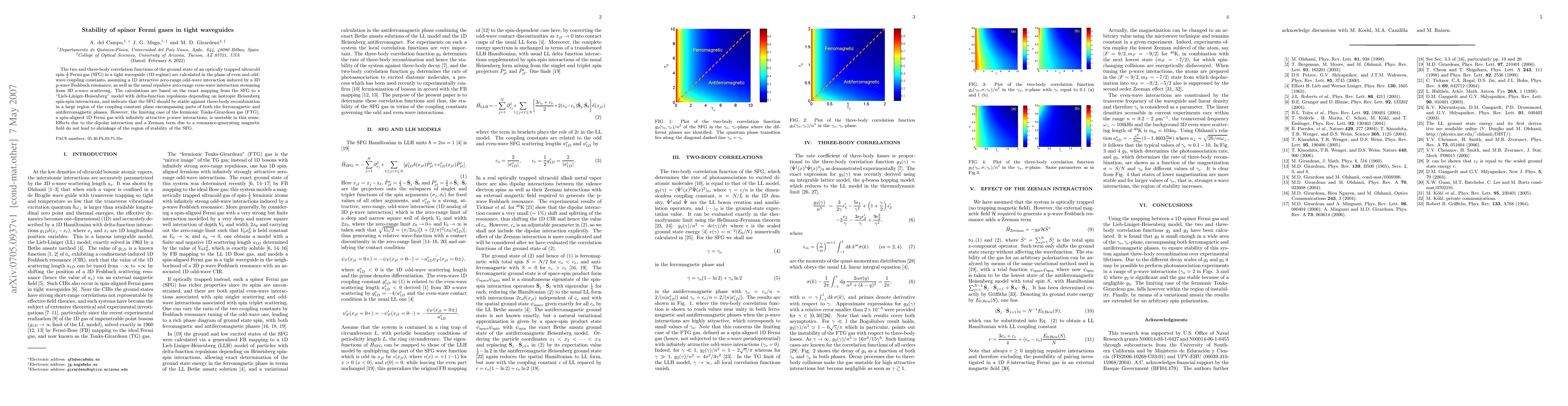 The two and three-body correlation functions of the ground state of an optically trapped ultracold spin-1/2 Fermi gas (SFG) in a tight waveguide (1D regime) are calculated in the plane of even and odd-wave coupling constants, assuming a 1D attractive zero-range odd-wave interaction induced by a 3D p-wave Feshbach resonance, as well as the usual repulsive zero-range even-wave interaction stemming from 3D s-wave scattering. The calculations are based on the exact mapping from the SFG to a ``Lieb-Liniger-Heisenberg'' model with delta-function repulsions depending on isotropic Heisenberg spin-spin interactions, and indicate that the SFG should be stable against three-body recombination in a large region of the coupling constant plane encompassing parts of both the ferromagnetic and antiferromagnetic phases. However, the limiting case of the fermionic Tonks-Girardeau gas (FTG), a spin-aligned 1D Fermi gas with infinitely attractive p-wave interactions, is unstable in this sense. Effects due to the dipolar interaction and a Zeeman term due to a resonance-generating magnetic field do not lead to shrinkage of the region of stability of the SFG.