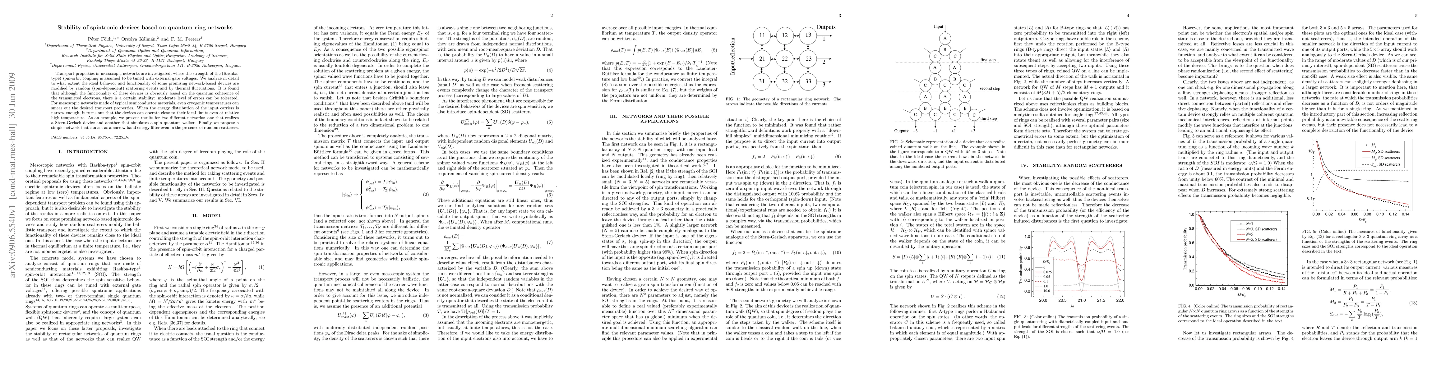 The research examines the stability of spintronic devices using quantum ring networks, finding that these devices can maintain functionality even with moderate errors. Despite cryogenic temperatures potentially smearing out desired transport properties in typical semiconductor materials, narrow energy distribution of input carriers allows operation near ideal limits at higher temperatures. The study presents results for a Stern-Gerlach device and a spin quantum walker network, and proposes a simple network for use as a narrow band energy filter amidst random scatterers.
