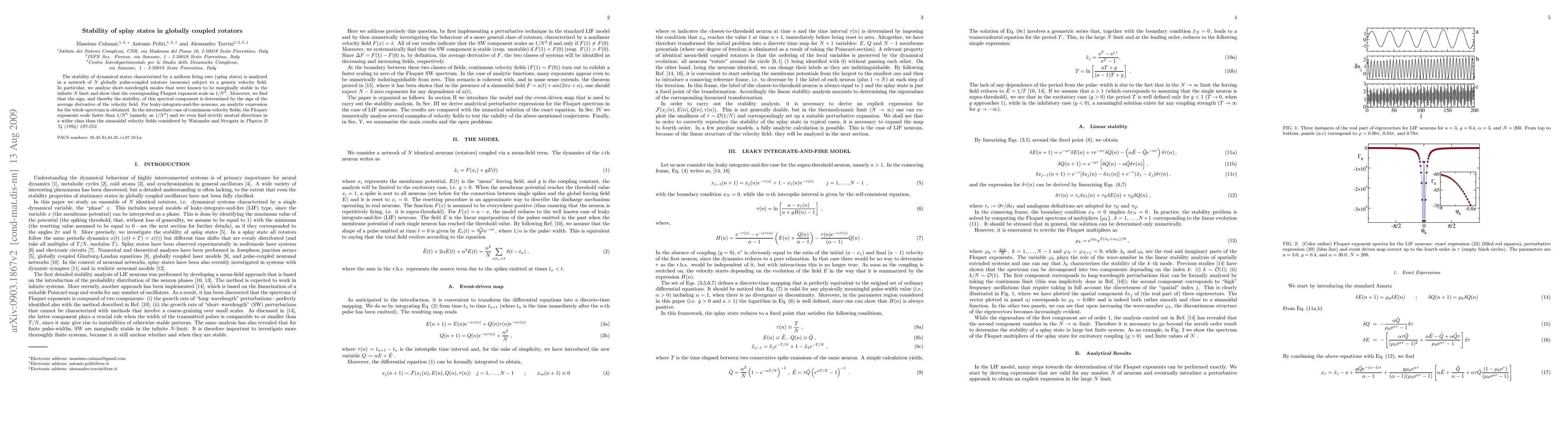 The stability of dynamical states characterized by a uniform firing rate ({\it splay states}) is analyzed in a network of $N$ globally pulse-coupled rotators (neurons) subject to a generic velocity field. In particular, we analyse short-wavelength modes that were known to be marginally stable in the infinite $N$ limit and show that the corresponding Floquet exponent scale as $1/N^2$. Moreover, we find that the sign, and thereby the stability, of this spectral component is determined by the sign of the average derivative of the velocity field. For leaky-integrate-and-fire neurons, an analytic expression for the whole spectrum is obtained. In the intermediate case of continuous velocity fields, the Floquet exponents scale faster than $1/N^2$ (namely, as $1/N^4$) and we even find strictly neutral directions in a wider class than the sinusoidal velocity fields considered by Watanabe and Strogatz in {\it Physica D 74 (1994) 197-253}.