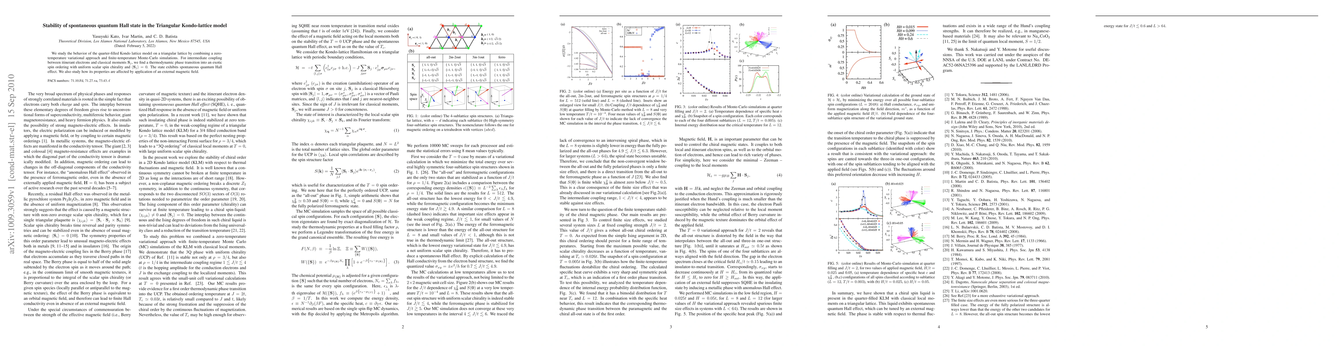 This paper investigates the stability of a spontaneous quantum Hall state in a quarter-filled Kondo lattice model on a triangular lattice, revealing a phase transition into an exotic spin ordering with uniform spin chirality and a zero net spin. The study combines variational and Monte-Carlo methods to explore the effects of an external magnetic field on this state.