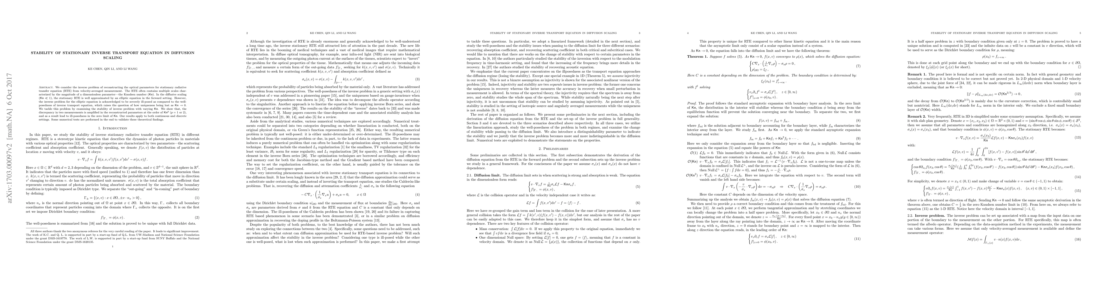 We consider the inverse problem of reconstructing the optical parameters for stationary radiative transfer equation (RTE) from velocity-averaged measurement. The RTE often contains multiple scales characterized by the magnitude of a dimensionless parameter---the Knudsen number ($K_n$). In the diffusive scaling ($K_n \ll 1$), the stationary RTE is well approximated by an elliptic equation in the forward setting. However, the inverse problem for the elliptic equation is acknowledged to be severely ill-posed as compared to the well-posedness of inverse transport equation, which raises the question of how uniqueness being lost as $K_n \rightarrow 0$. We tackle this problem by examining the stability of inverse problem with varying $K_n$. We show that, the discrepancy in two measurements is amplified in the reconstructed parameters at the order of $K_n^p~ (p = 1\text{ or} ~2)$, and as a result lead to ill-posedness in the zero limit of $K_n$. Our results apply to both continuous and discrete settings. Some numerical tests are performed in the end to validate these theoretical findings.