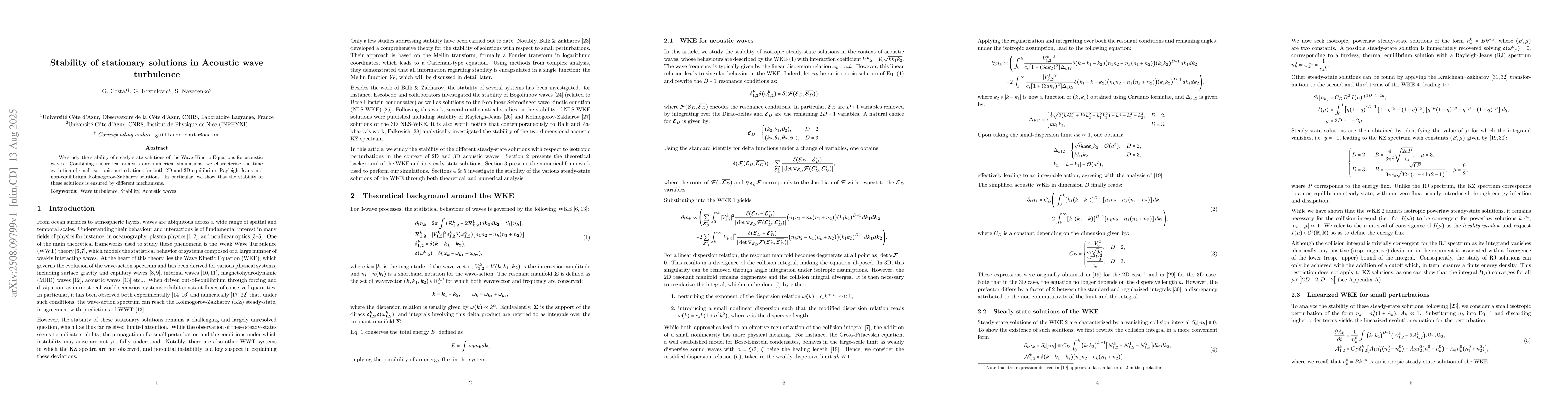 We study the stability of steady-state solutions of the Wave-Kinetic Equations for acoustic waves. Combining theoretical analysis and numerical simulations, we characterise the time evolution of small isotropic perturbations for both 2D and 3D equilibrium Rayleigh-Jeans and non-equilibrium Kolmogorov-Zakharov solutions. In particular, we show that the stability of these solutions is ensured by different mechanisms.