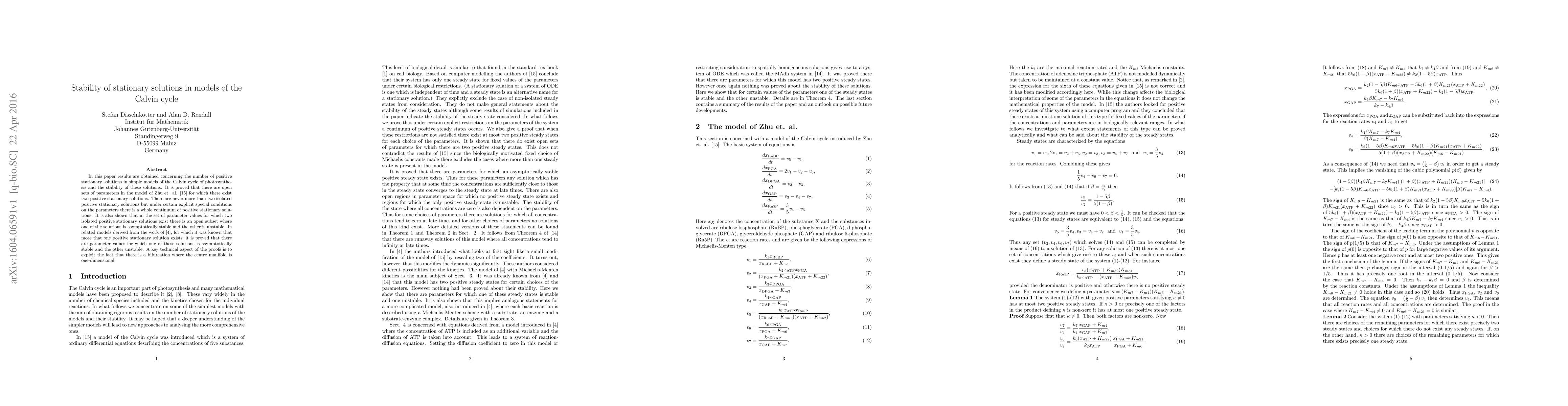 In this paper results are obtained concerning the number of positive stationary solutions in simple models of the Calvin cycle of photosynthesis and the stability of these solutions. It is proved that there are open sets of parameters in a model of Zhu et. al. for which there exist two positive stationary solutions. There are never more than two isolated positive stationary solutions but under certain explicit special conditions on the parameters there is a whole continuum of positive stationary solutions. It is also shown that in the set of parameter values for which two isolated positive stationary solutions exist there is an open subset where one of the solutions is asymptotically stable and the other is unstable. In related models , for which it was known that more that one positive stationary solution exists, it is proved that there are parameter values for which one of these solutions is asymptotically stable and the other unstable. A key technical aspect of the proofs is to exploit the fact that there is a bifurcation where the centre manifold is one-dimensional.