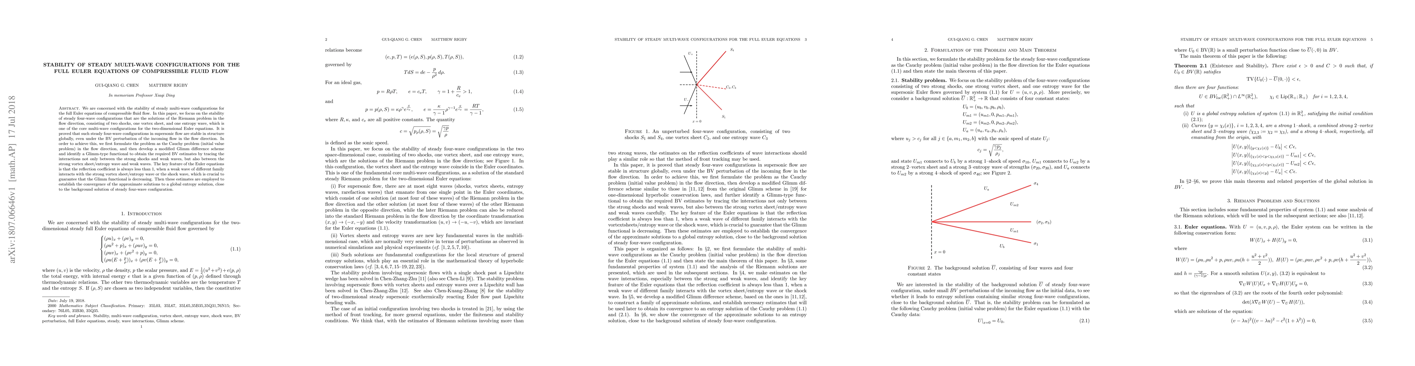This paper investigates the global stability of steady four-wave configurations in supersonic flow, which include two shocks, a vortex sheet, and an entropy wave, solving the Riemann problem for the Euler equations of compressible fluid flow. The authors prove that these configurations are stable under BV perturbations using a modified Glimm difference scheme and a Glimm-type functional, leveraging the reflection property of the Euler equations.