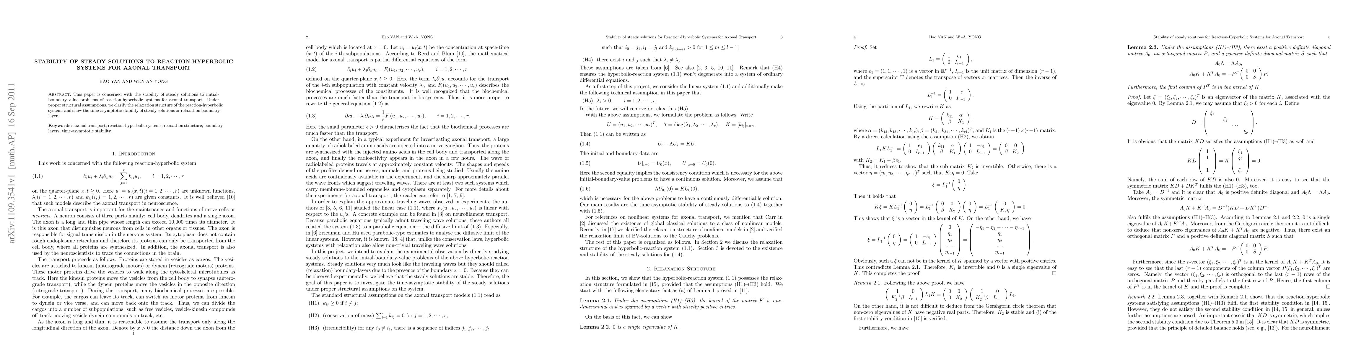 This paper investigates the stability of steady solutions for reaction-hyperbolic systems modeling axonal transport, demonstrating their time-asymptotic stability under specific structural conditions, and identifying relaxation boundary-layer behavior.
