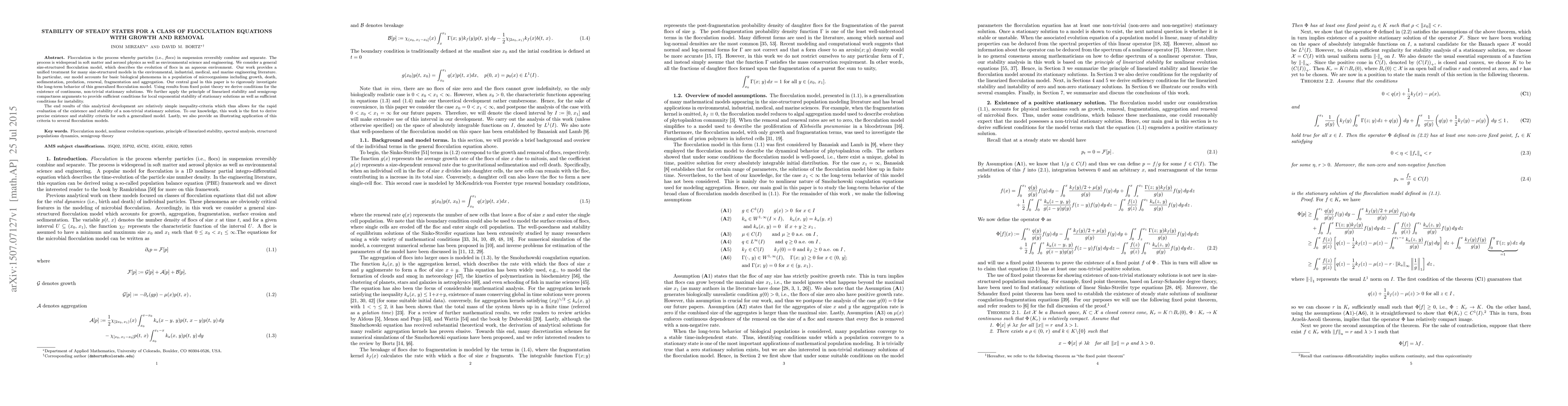 Flocculation is the process whereby particles (i.e., flocs) in suspension reversibly combine and separate. The process is widespread in soft matter and aerosol physics as well as environmental science and engineering. We consider a general size-structured flocculation model, which describes the evolution of flocs in an aqueous environment. Our work provides a unified treatment for many size-structured models in the environmental, industrial, medical, and marine engineering literature. In particular, our model accounts for basic biological phenomena in a population of microorganisms including growth, death, sedimentation, predation, renewal, fragmentation and aggregation. Our central goal in this paper is to rigorously investigate the long-term behavior of this generalized flocculation model. Using results from fixed point theory we derive conditions for the existence of continuous, non-trivial stationary solutions. We further apply the principle of linearized stability and semigroup compactness arguments to provide sufficient conditions for local exponential stability of stationary solutions as well as sufficient conditions for instability. Abstract. The end results of this analytical development are relatively simple inequality-criteria which thus allows for the rapid evaluation of the existence and stability of a non-trivial stationary solution. To our knowledge, this work is the first to derive precise existence and stability criteria for such a generalized model. Lastly, we also provide an illustrating application of this criteria to several flocculation models.