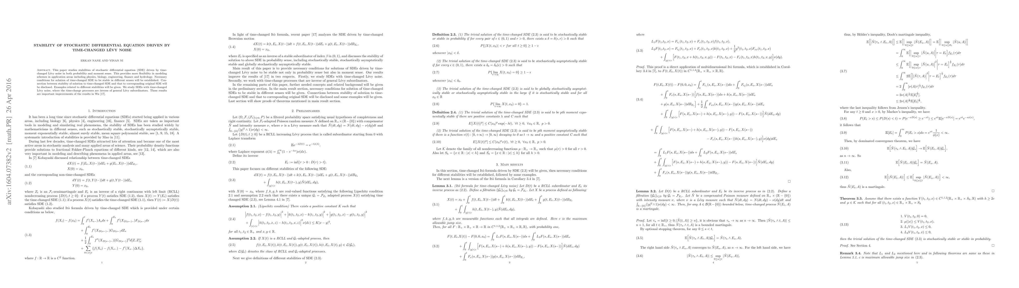 This paper investigates the stability of stochastic differential equations driven by time-changed Lévy noise in both probability and moment senses, establishing necessary conditions for stability and linking it to the stability of the corresponding original SDE. This enhances modeling flexibility across various fields.