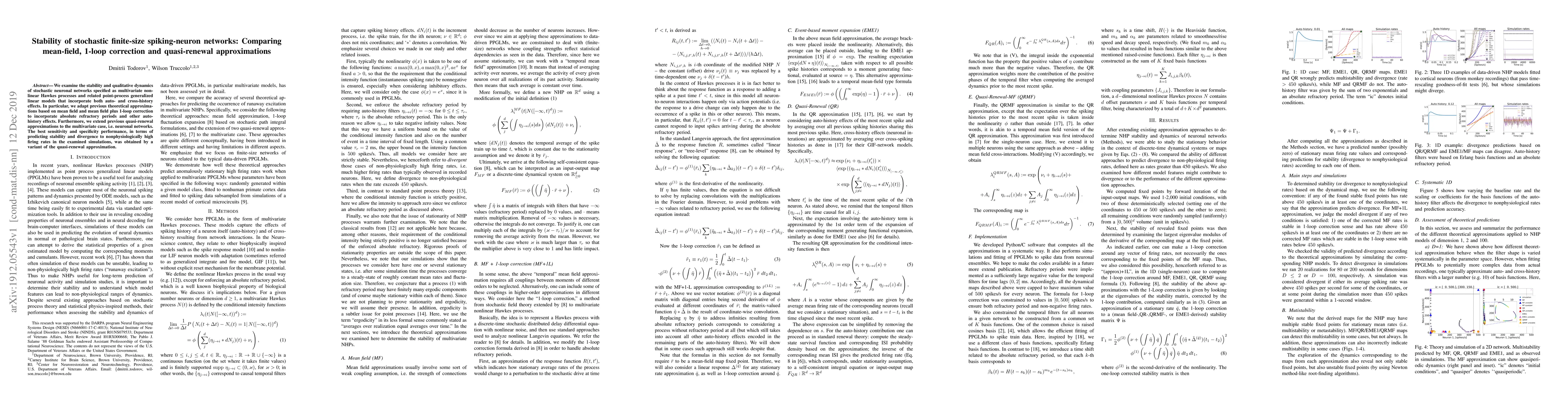 We examine the stability and qualitative dynamics of stochastic neuronal networks specified as multivariate nonlinear Hawkes processes and related point-process generalized linear models that incorporate both auto- and cross-history effects. In particular, we adapt previous theoretical approximations based on mean field and mean field plus 1-loop correction to incorporate absolute refractory periods and other auto-history effects. Furthermore, we extend previous quasi-renewal approximations to the multivariate case, i.e. neuronal networks. The best sensitivity and specificity performance, in terms of predicting stability and divergence to nonphysiologically high firing rates in the examined simulations, was obtained by a variant of the quasi-renewal approximation.