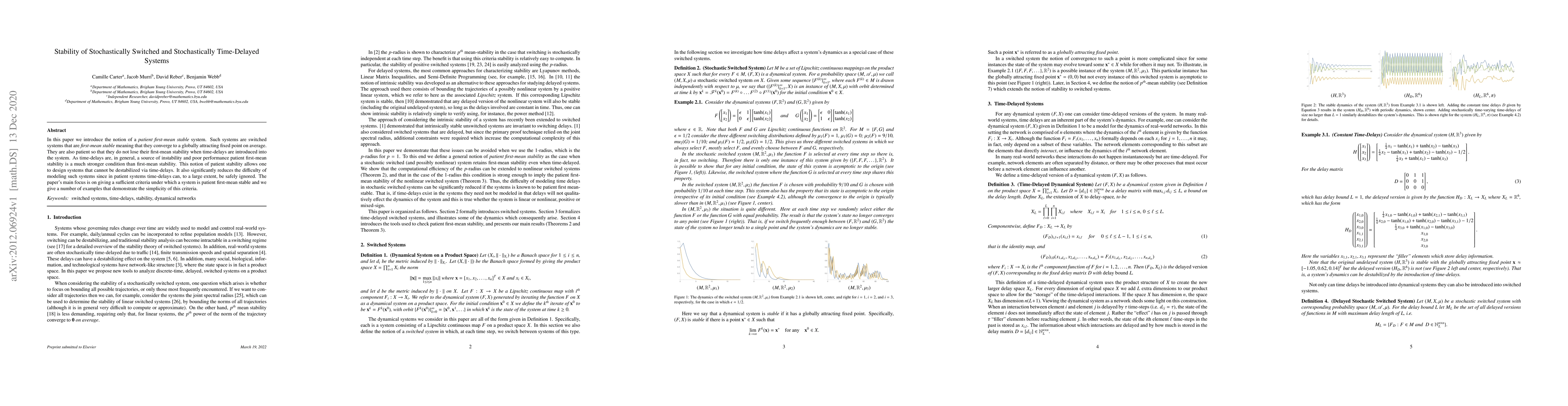 In this paper we introduce the notion of a patient first-mean stable system. Such systems are switched systems that are first-mean stable meaning that they converge to a globally attracting fixed point on average. They are also patient so that they do not lose their first-mean stability when time-delays are introduced into the system. As time-delays are, in general, a source of instability and poor performance patient first-mean stability is a much stronger condition than first-mean stability. This notion of patient stability allows one to design systems that cannot be destabilized via time-delays. It also significantly reduces the difficulty of modeling such systems since in patient systems time-delays can, to a large extent, be safely ignored. The paper's main focus is on giving a sufficient criteria under which a system is patient first-mean stable and we give a number of examples that demonstrate the simplicity of this criteria.