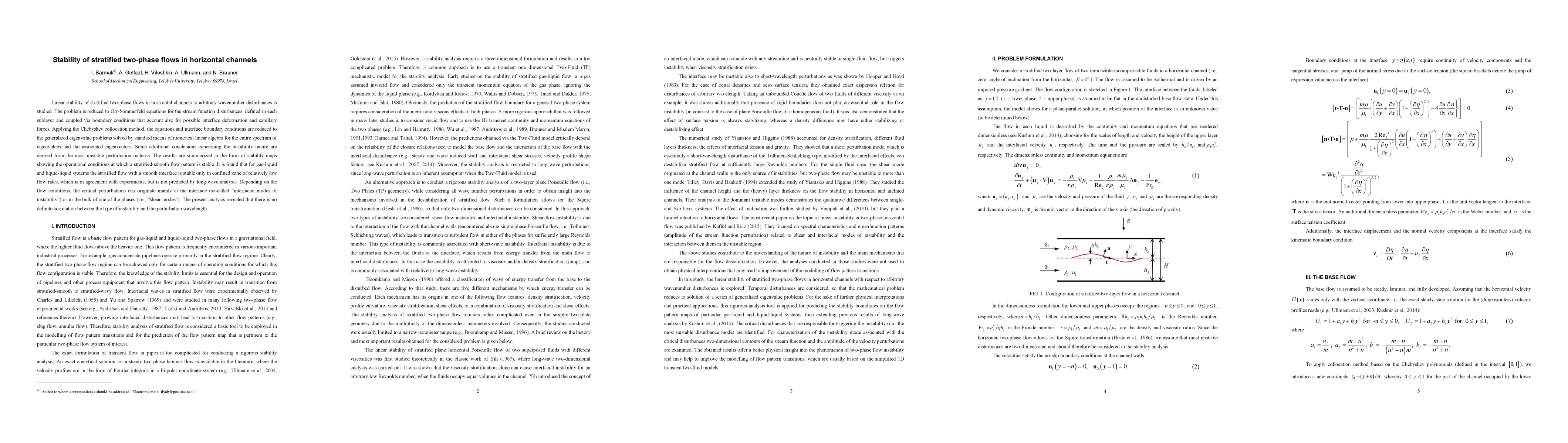 This study investigates the linear stability of stratified two-phase flows in horizontal channels using Orr-Sommerfeld equations and Chebyshev collocation method, revealing that stable stratified flow is limited to a narrow range of low flow rates, with instabilities originating either at the interface or within the fluid bulk.
