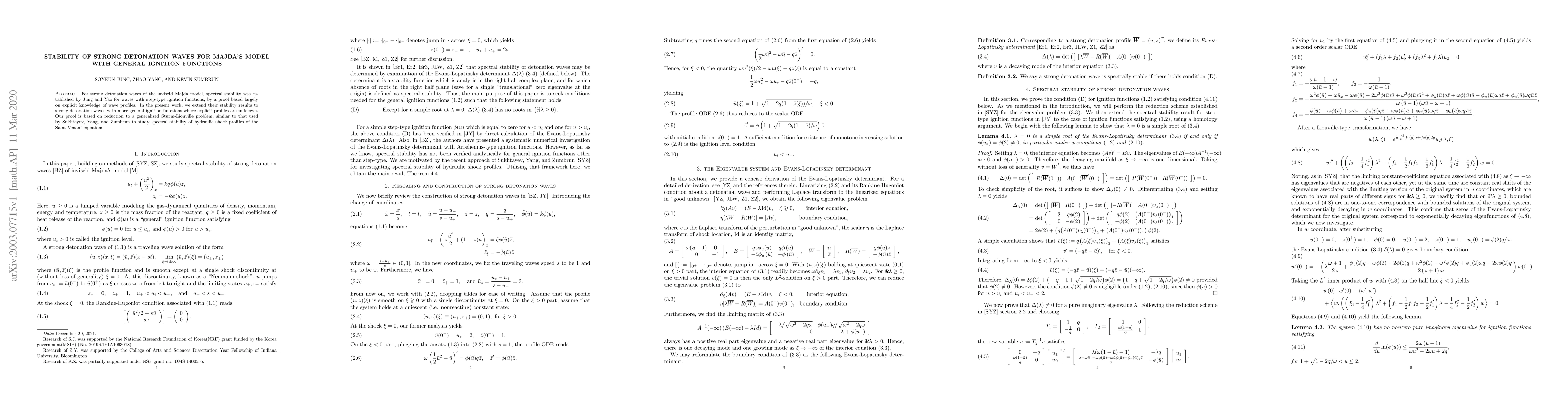 This paper extends the spectral stability results for strong detonation waves in the inviscid Majda model to waves with more general ignition functions, where explicit profiles are not available. The proof leverages a reduction to a generalized Sturm-Liouville problem, similar to methods used for studying hydraulic shock profiles.