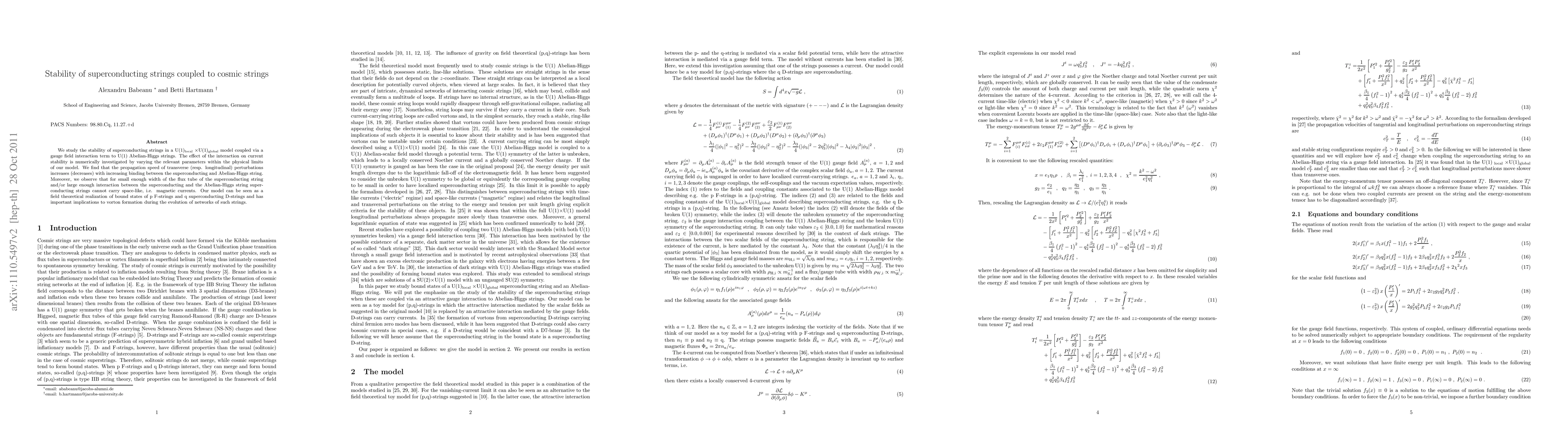 This paper investigates the stability of superconducting strings coupled to cosmic strings in a U(1)_{local} x U(1)_{global} model, finding that the interaction affects the propagation speed of perturbations. It concludes that strong coupling prevents superconducting strings from carrying magnetic currents, with implications for vorton formation in string networks.