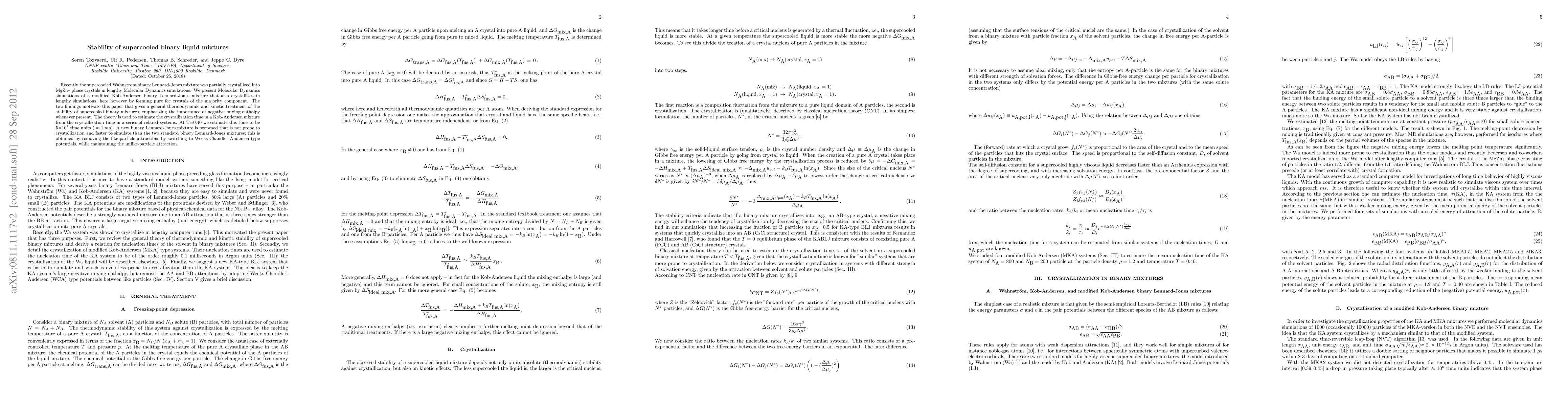 Recently the supercooled Wahnstrom binary Lennard-Jones mixture was partially crystallized into ${\rm MgZn_2}$ phase crystals in lengthy Molecular Dynamics simulations. We present Molecular Dynamics simulations of a modified Kob-Andersen binary Lennard-Jones mixture that also crystallizes in lengthy simulations, here however by forming pure fcc crystals of the majority component. The two findings motivate this paper that gives a general thermodynamic and kinetic treatment of the stability of supercooled binary mixtures, emphasizing the importance of negative mixing enthalpy whenever present. The theory is used to estimate the crystallization time in a Kob-Andersen mixture from the crystallization time in a series of relared systems. At T=0.40 we estimate this time to be 5$\times 10^{7}$ time units ($\approx 1. ms$). A new binary Lennard-Jones mixture is proposed that is not prone to crystallization and faster to simulate than the two standard binary Lennard-Jones mixtures; this is obtained by removing the like-particle attractions by switching to Weeks-Chandler-Andersen type potentials, while maintaining the unlike-particle attraction.