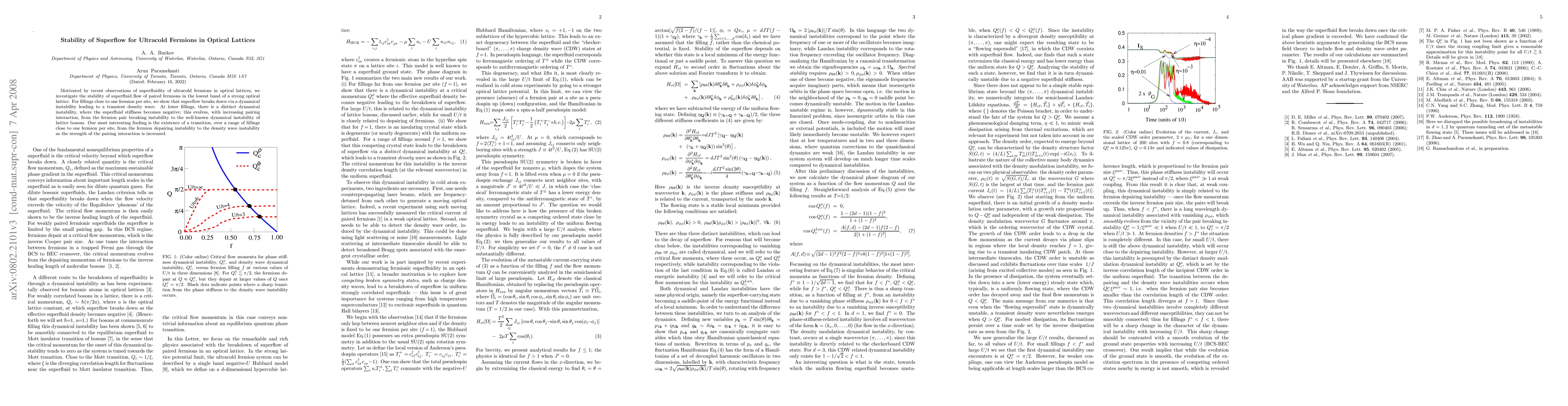 This paper explores the stability of superfluid flow in ultracold fermions within optical lattices, revealing that superflow breaks down via instabilities leading to transient density waves or negative superfluid stiffness, transitioning from fermion depairing to density wave instability as pairing interaction strength increases.