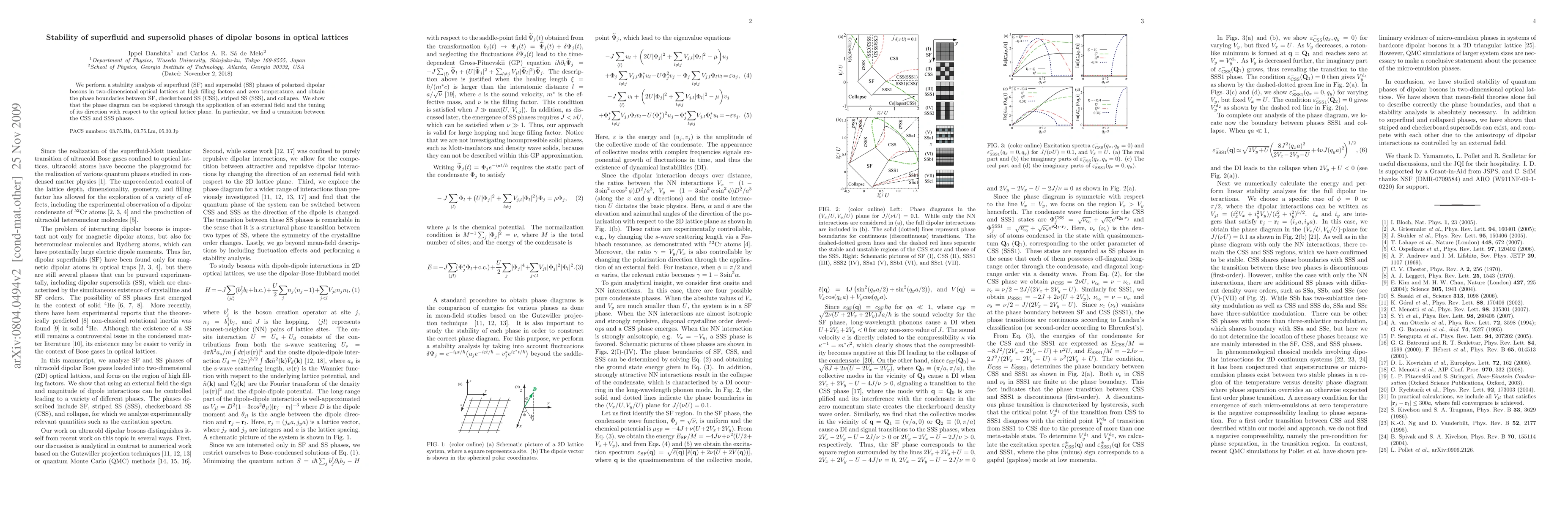 This study analyzes the stability of superfluid and supersolid phases of dipolar bosons in optical lattices, revealing phase boundaries and transitions influenced by external fields and their orientation relative to the lattice plane. The research identifies a transition between checkerboard and striped supersolid phases.