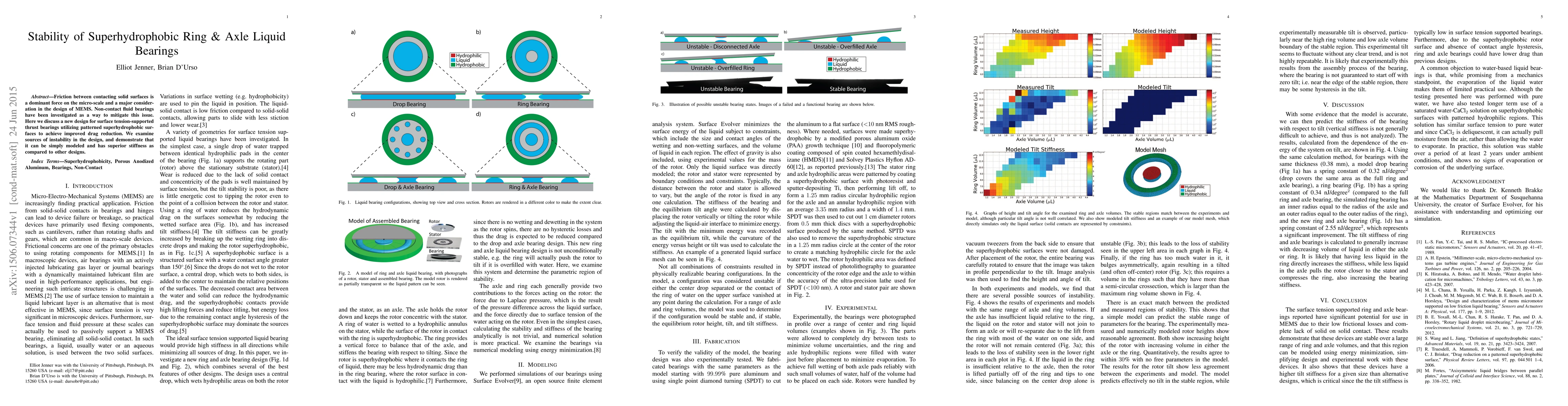 This paper introduces a new superhydrophobic ring & axle liquid bearing design to reduce friction in MEMS devices, utilizing surface tension for support. It analyzes potential instability sources and shows that the design has superior stiffness compared to other methods.