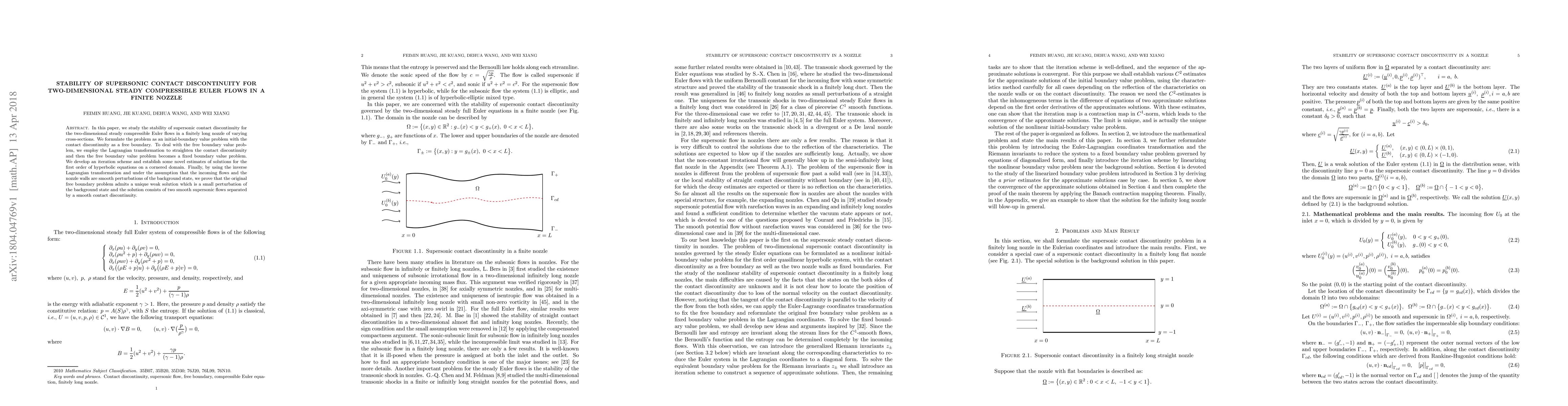 This paper investigates the stability of supersonic contact discontinuities in two-dimensional steady compressible Euler flows within a finite nozzle of varying cross-sections. It employs a Lagrangian transformation to convert the free boundary problem into a fixed boundary problem, develops an iterative scheme, and proves the existence of a unique weak solution that maintains a smooth contact discontinuity separating two smooth supersonic flows.