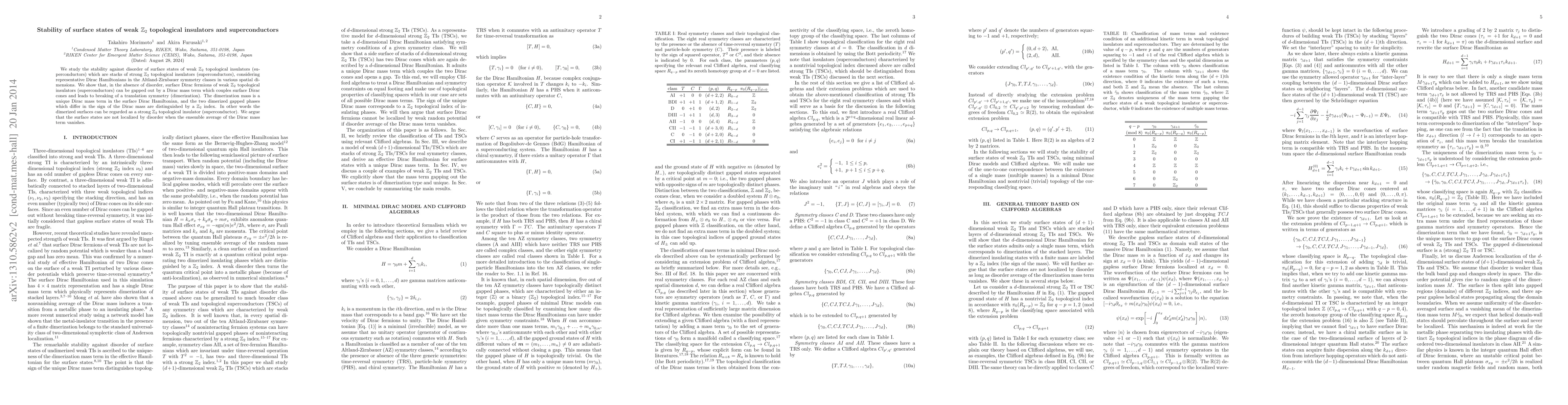 This paper investigates the robustness of surface states in weak $\mathbb{Z}_2$ topological insulators and superconductors under disorder, demonstrating that their surface Dirac fermions can be gapped by a dimerization mass term, which breaks translation symmetry. It concludes that disorder does not localize these states when the average Dirac mass vanishes.