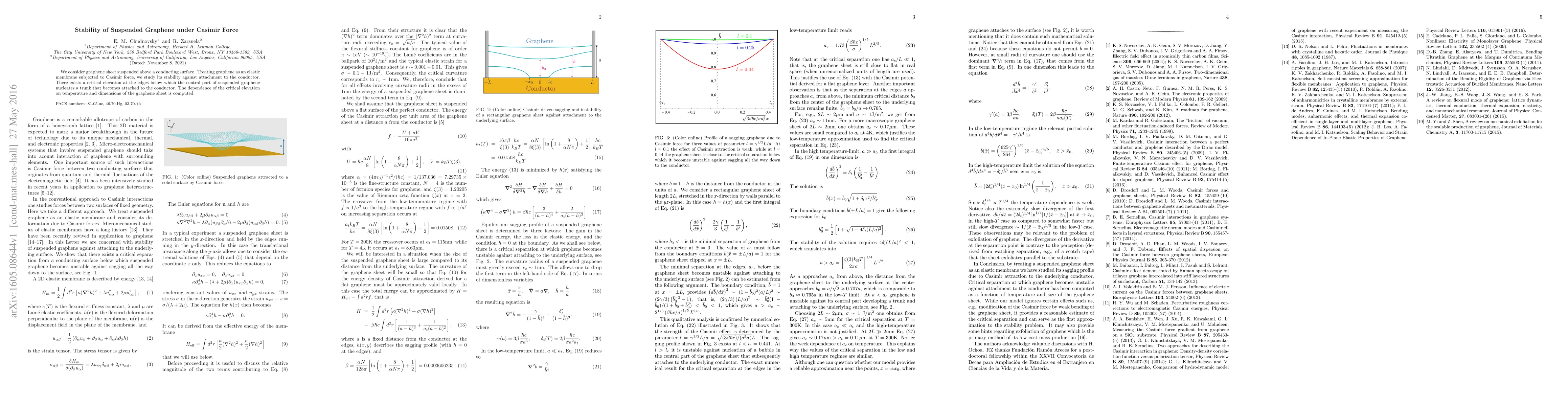 This study investigates the stability of suspended graphene subjected to Casimir force, finding a critical elevation below which graphene nucleates a trunk that attaches to a nearby conductor. The research computes the critical elevation's dependence on temperature and graphene dimensions.