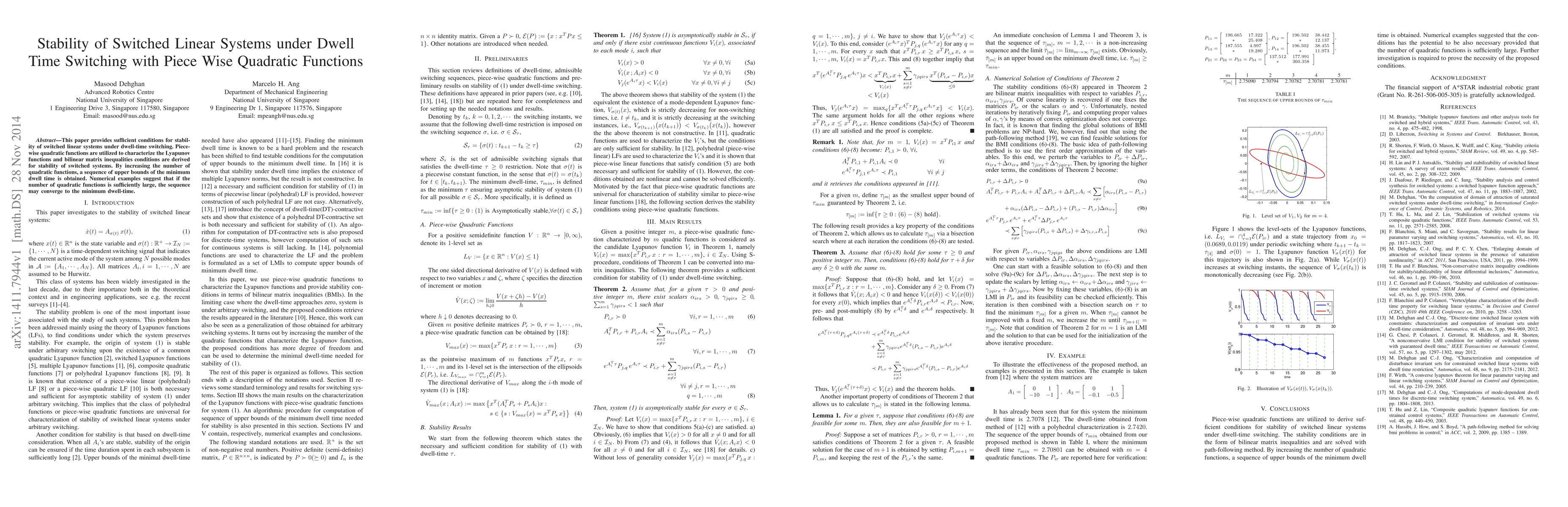 Piece-wise quadratic functions are utilized to derive sufficient conditions for stability of switched linear systems under dwell-time switching.