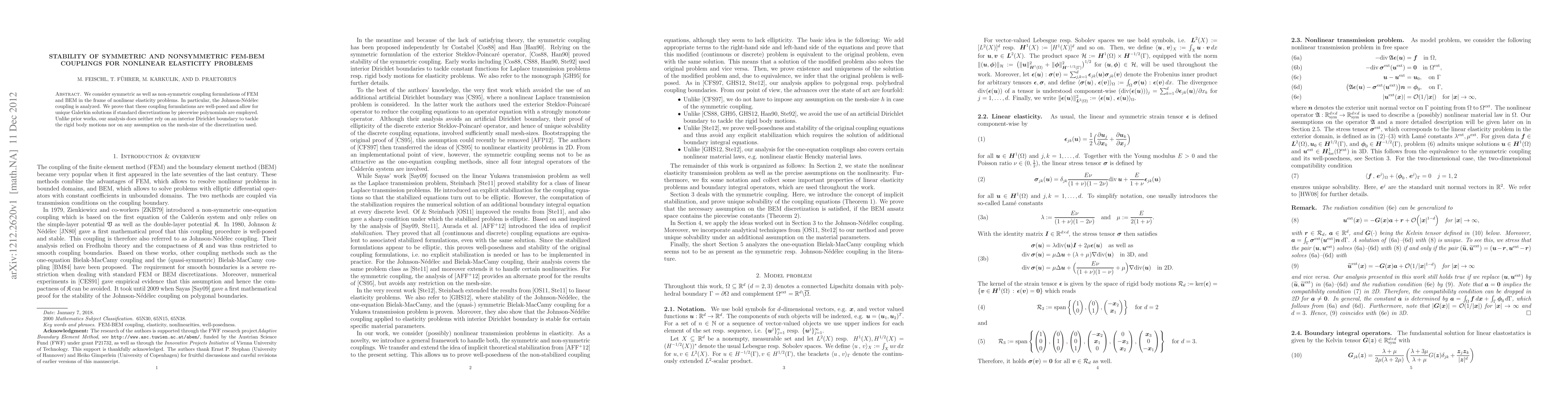 This paper investigates both symmetric and non-symmetric coupling formulations of FEM and BEM for nonlinear elasticity problems, proving their well-posedness and unique Galerkin solutions without relying on interior Dirichlet boundaries or specific mesh-size assumptions. The Johnson-Nédelec coupling is specifically analyzed.