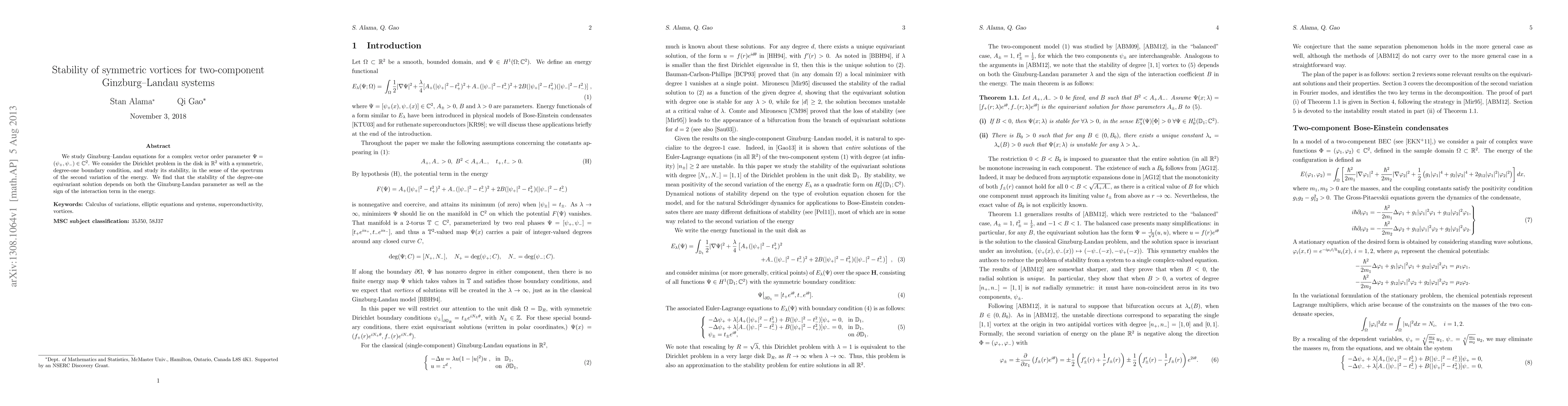 We study Ginzburg-Landau equations for a complex vector order parameter. We consider the Dirichlet problem in the disk in the plane with a symmetric, degree-one boundary condition, and study its stability, in the sense of the spectrum of the second variation of the energy. We find that the stability of the degree-one equivariant solution depends on both the Ginzburg-Landau parameter as well as the sign of the interaction term in the energy.