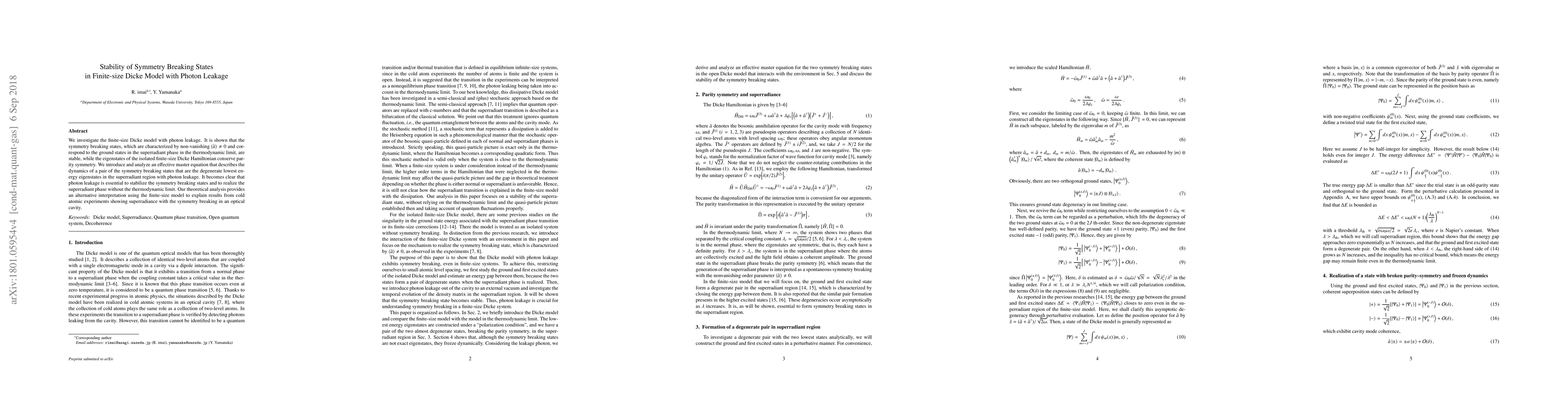 We investigate the finite-size Dicke model with photon leakage. It is shown that the symmetry breaking states, which are characterized by non-vanishing $\langle \hat{a} \rangle \neq 0$ and correspond to the ground states in the superradiant phase in the thermodynamic limit, are stable, while the eigenstates of the isolated finite-size Dicke Hamiltonian conserve parity symmetry. We introduce and analyze an effective master equation that describes the dynamics of a pair of the symmetry breaking states that are the degenerate lowest energy eigenstates in the superradiant region with photon leakage. It becomes clear that photon leakage is essential to stabilize the symmetry breaking states and to realize the superradiant phase without the thermodynamic limit. Our theoretical analysis provides an alternative interpretation using the finite-size model to explain results from cold atomic experiments showing superradiance with the symmetry breaking in an optical cavity.