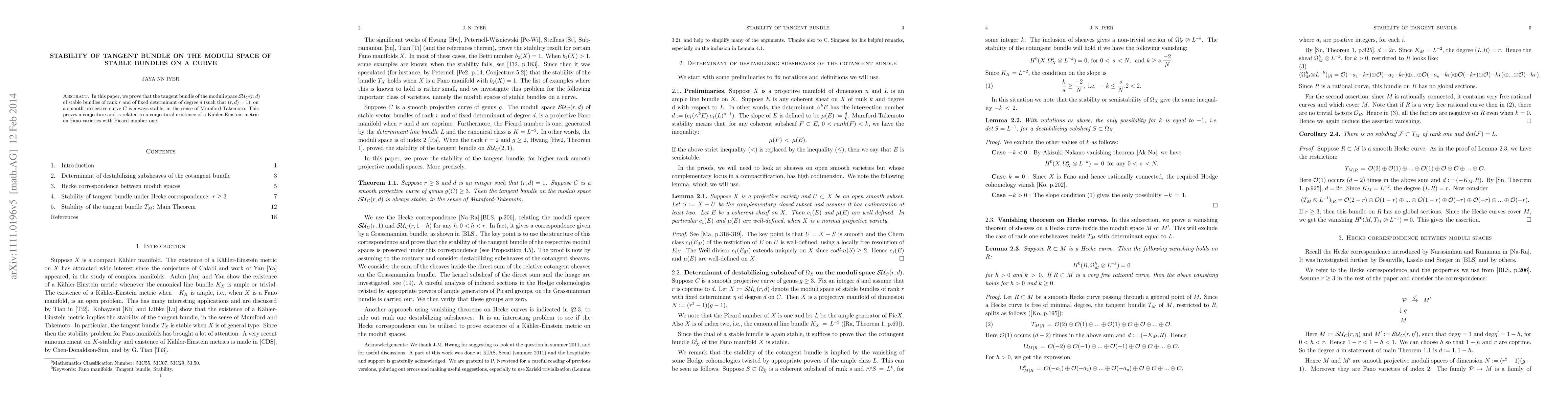Summary: This paper proves the stability of the tangent bundle on the moduli space of stable vector bundles on a smooth projective curve, verifying a longstanding conjecture and linking it to the existence of Kähler-Einstein metrics on Fano varieties.