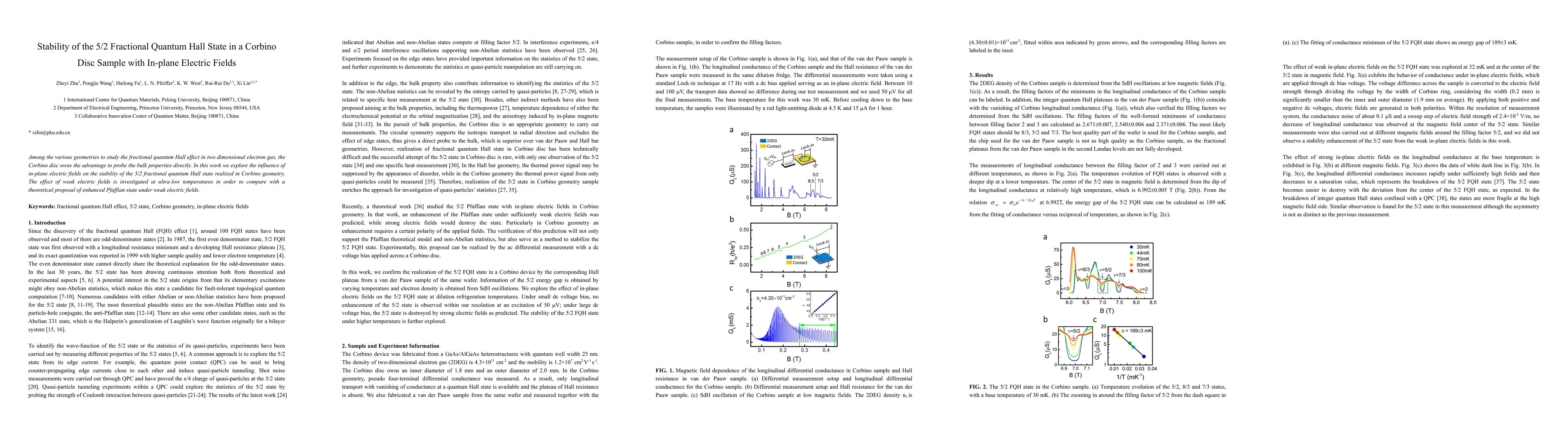 Among the various geometries to study the fractional quantum Hall effect in two dimensional electron gas, the Corbino disc owns the advantage to probe the bulk properties directly. In this work we explore the influence of in-plane electric fields on the stability of the 5/2 fractional quantum Hall state realized in Corbino geometry. The effect of weak electric fields is investigated at ultra-low temperatures in order to compare with a theoretical proposal of enhanced Pfaffian state under weak electric fields.
