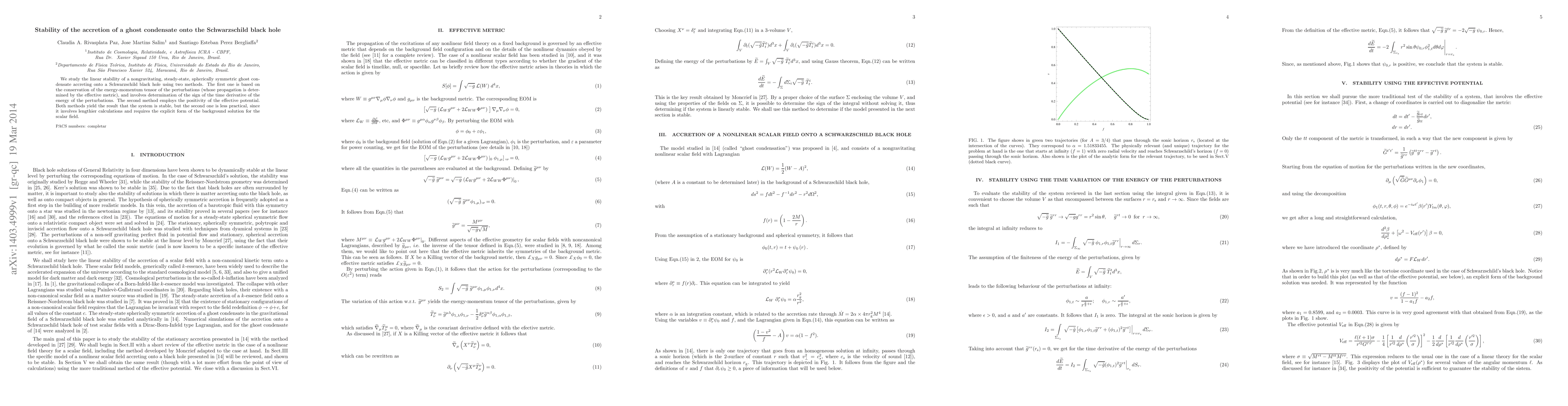 We study the linear stability of a nongravitating, steady-state, spherically symmetric ghost condensate accreting onto a Schwarzschild black hole using two methods. The first one is based on the conservation of the energy-momentum tensor of the perturbations (whose propagation is determined by the effective metric), and involves the determination of the sign of the time derivative of the energy of the perturbations. The second method employs the positivity of the effective potential. Both methods yield the result that the system is stable, but the second one is less practical, since it involves lengthier calculations and requires the explicit form of the background solution for the scalar field.