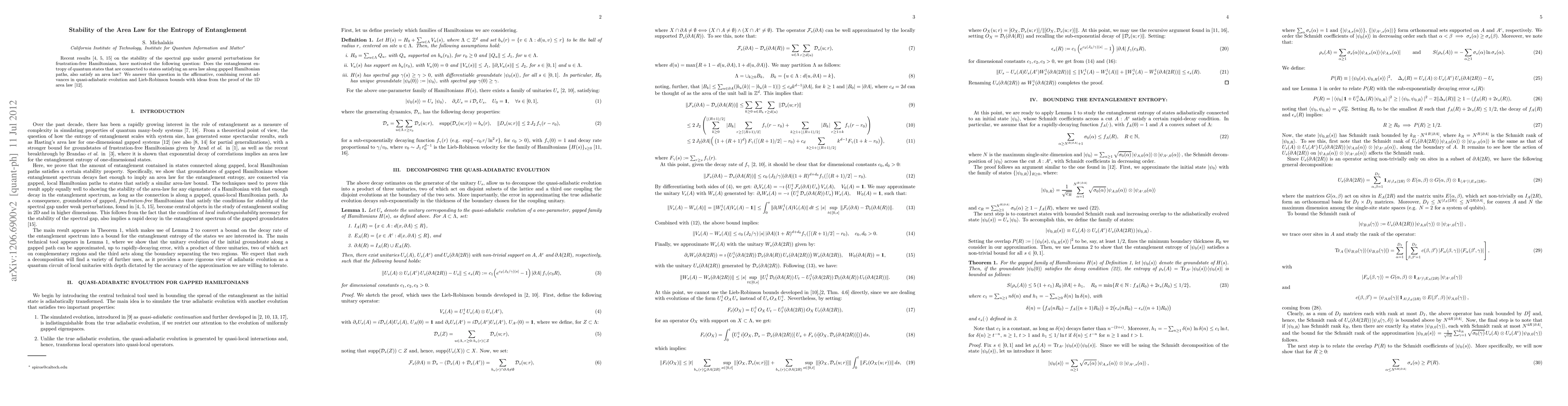 The research confirms that the entanglement entropy of quantum states connected via gapped Hamiltonian paths, which satisfy an area law, also adheres to an area law. This conclusion integrates quasi-adiabatic evolution, Lieb-Robinson bounds, and insights from the 1D area law proof.