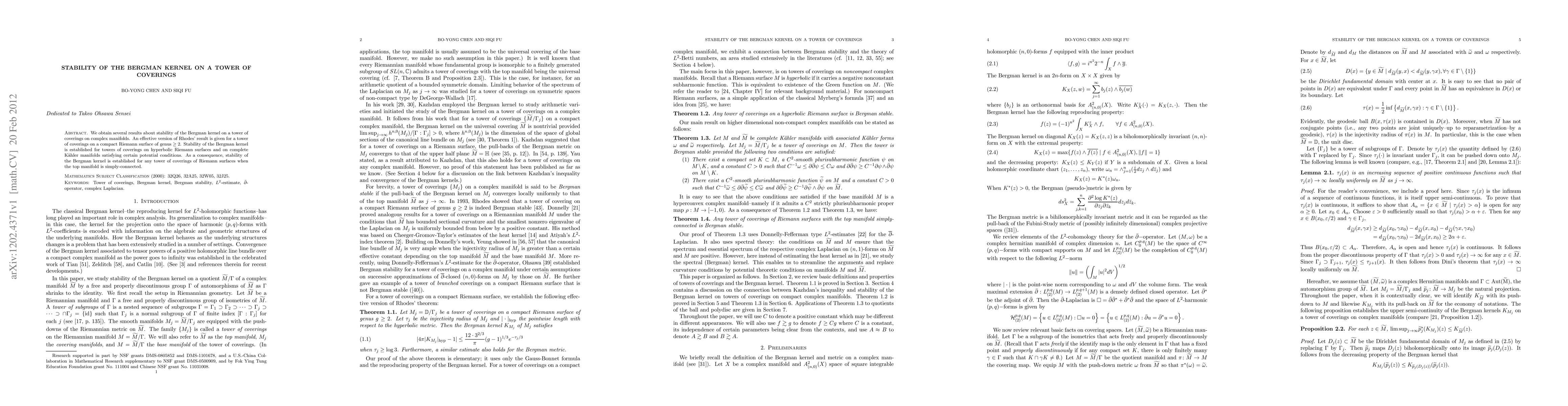 The paper establishes stability of the Bergman kernel for towers of coverings on various complex manifolds, including hyperbolic Riemann surfaces and complete Kähler manifolds under certain conditions, and proves stability for any tower of coverings of Riemann surfaces when the top manifold is simply-connected.