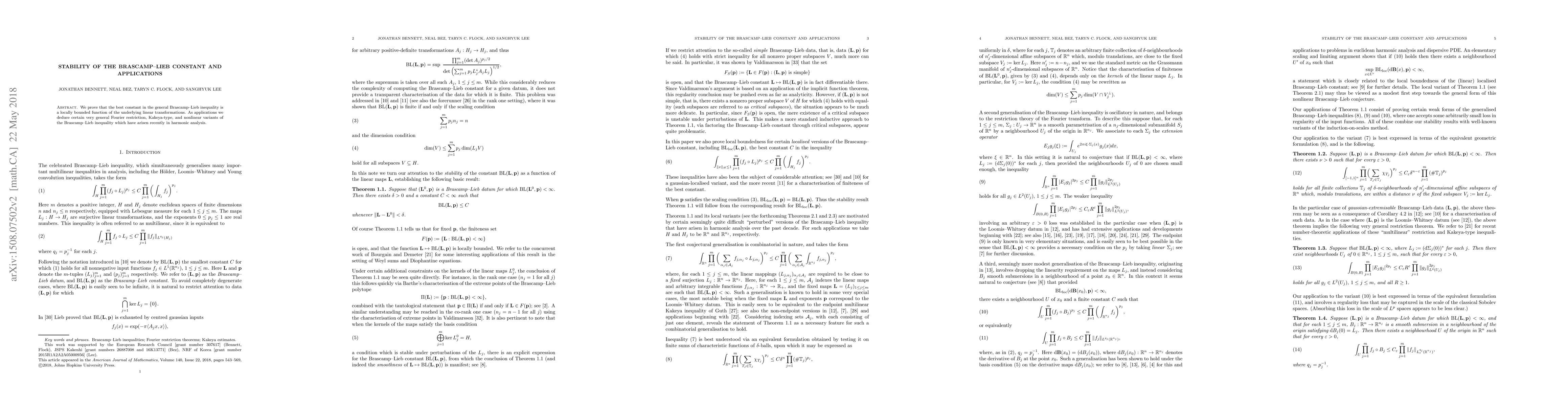 The paper proves that the Brascamp-Lieb constant is locally bounded under linear transformations, and applies this result to derive new Fourier restriction, Kakeya-type, and nonlinear variants of the Brascamp-Lieb inequality in harmonic analysis.