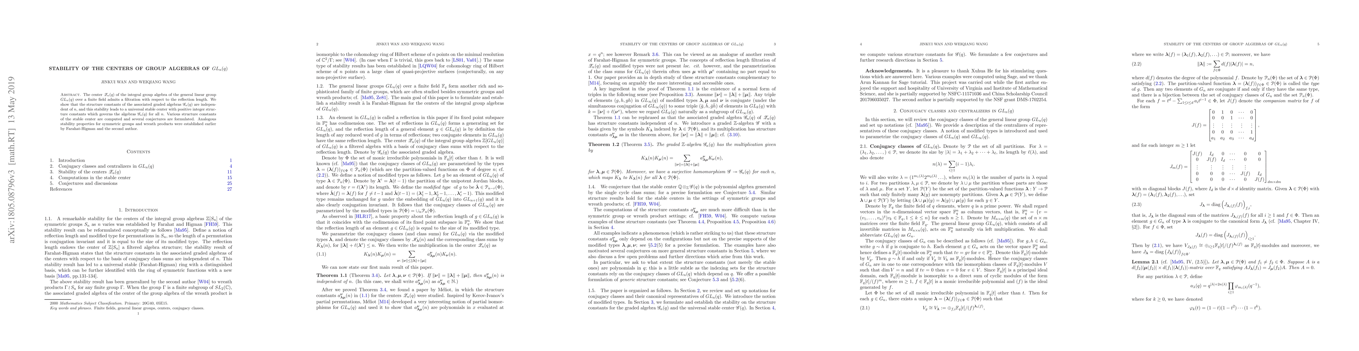 The center $\mathscr{Z}_n(q)$ of the integral group algebra of the general linear group $GL_n(q)$ over a finite field admits a filtration with respect to the reflection length. We show that the structure constants of the associated graded algebras $\mathscr{G}_n(q)$ are independent of $n$, and this stability leads to a universal stable center with positive integer structure constants which governs the algebras $\mathscr{G}_n(q)$ for all $n$. Various structure constants of the stable center are computed and several conjectures are formulated. Analogous stability properties for symmetric groups and wreath products were established earlier by Farahat-Higman and the second author.