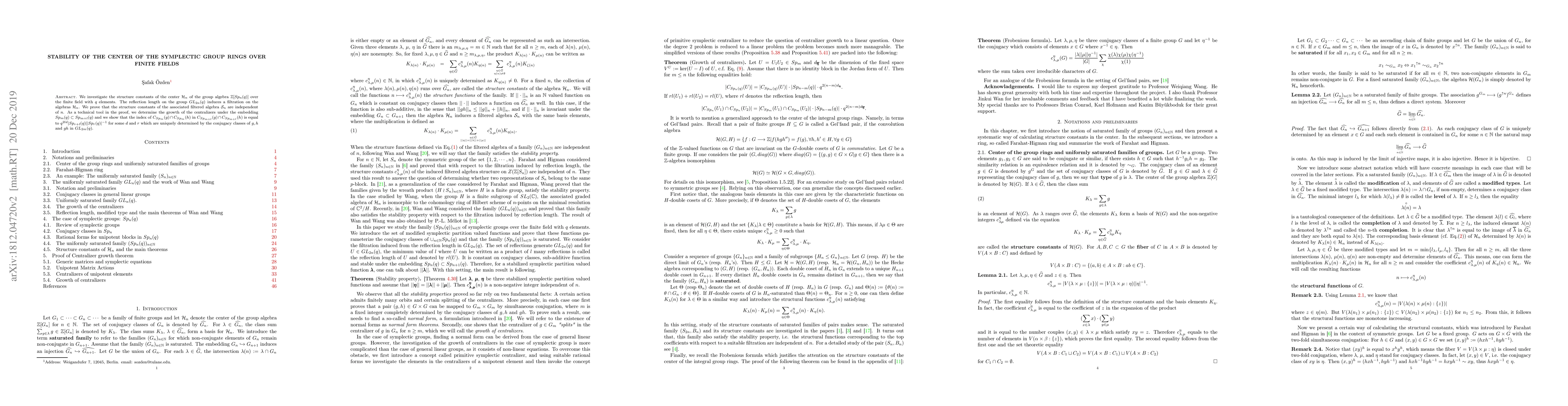 We investigate the structure constants of the center $\mathcal{H}_n$ of the group algebra $Sp_{n}(q)$ over a finite field. The reflection length on the group $GL_{2n}(q)$ induces a filtration on the algebras $\mathcal{H}_n$. We prove that the structure constants of the associated filtered algebra $\mathcal{S}_n$ are independent of $n$. As a technical tool in the proof, we determine the growth of the centralizers under the embedding $Sp_m(q)\subset Sp_{m+l}(q)$ and we show that the index of the centralizer of $g\in Sp_m(q)$ in the centralizer of $g\in Sp_{m+k}$ is equal to $q^{2ld}|Sp_{r+l}(q)||Sp_{r}(q)|^{-1}$ for some $d$ and $r$ which are uniquely determined by the conjugacy class of $g$ in $GL_{2n}(q).$