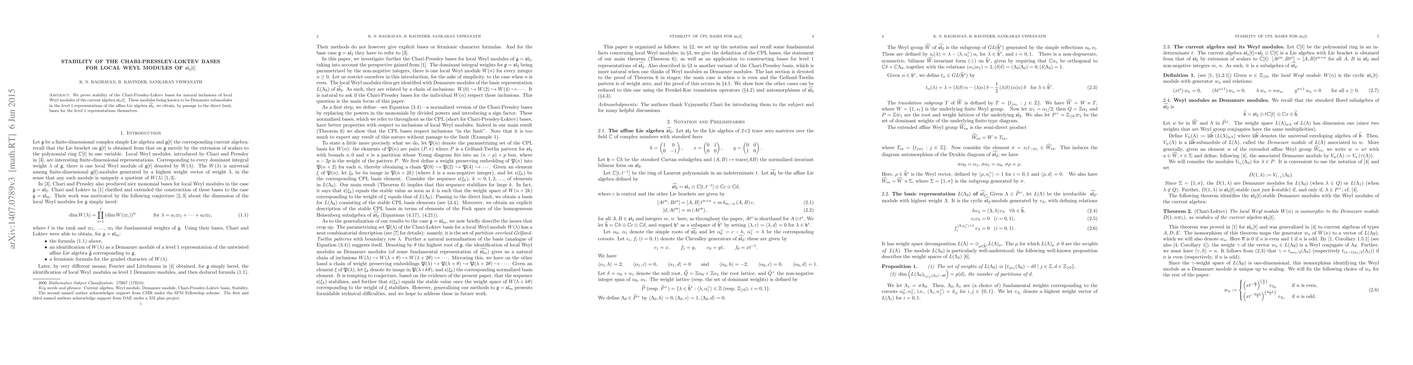 Summary: The paper proves the stability of Chari-Pressley-Loktev bases for local Weyl modules in $sl_2[t]$ and demonstrates that these bases extend to the level 1 representations of the affine Lie algebra $\widehat{sl_2}$ through Demazure submodules.