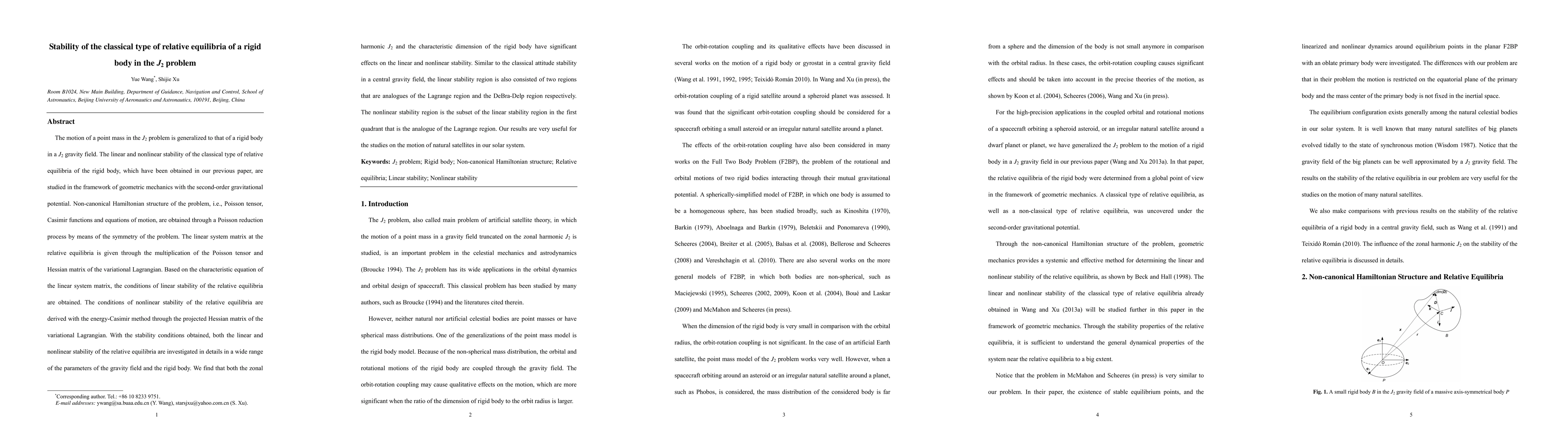 This paper investigates the stability of relative equilibria of a rigid body in a J2 gravity field, finding that both linear and nonlinear stability depend on parameters like gravity field strength and rigid body size.