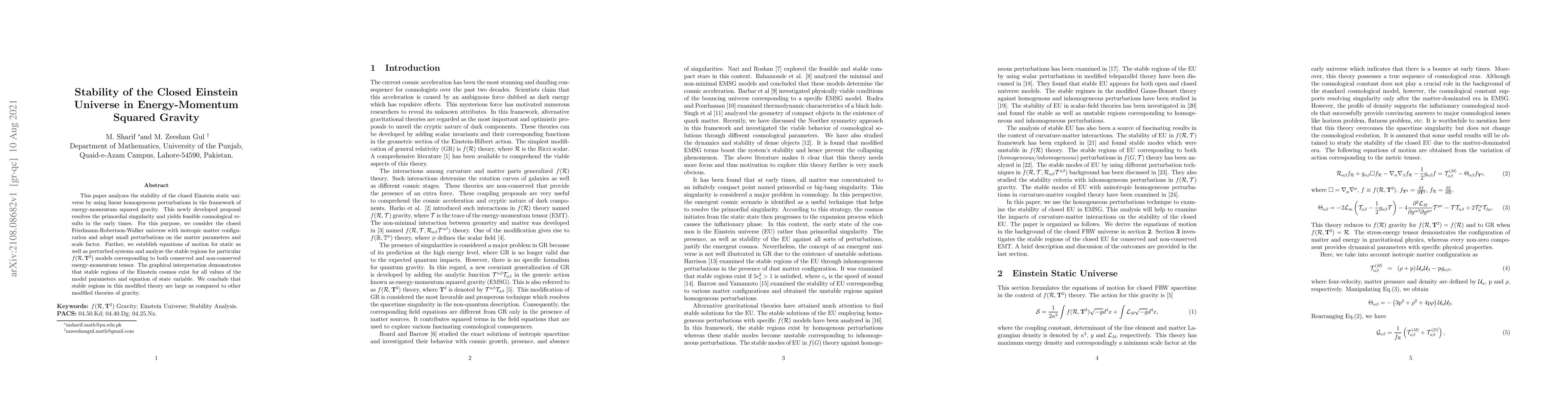 This paper investigates the stability of the closed Einstein universe in energy-momentum squared gravity, finding stable regions for various $f(\mathcal{R},\mathbf{T}^{2})$ models, indicating that the modified theory supports larger stable regions compared to other gravity theories.