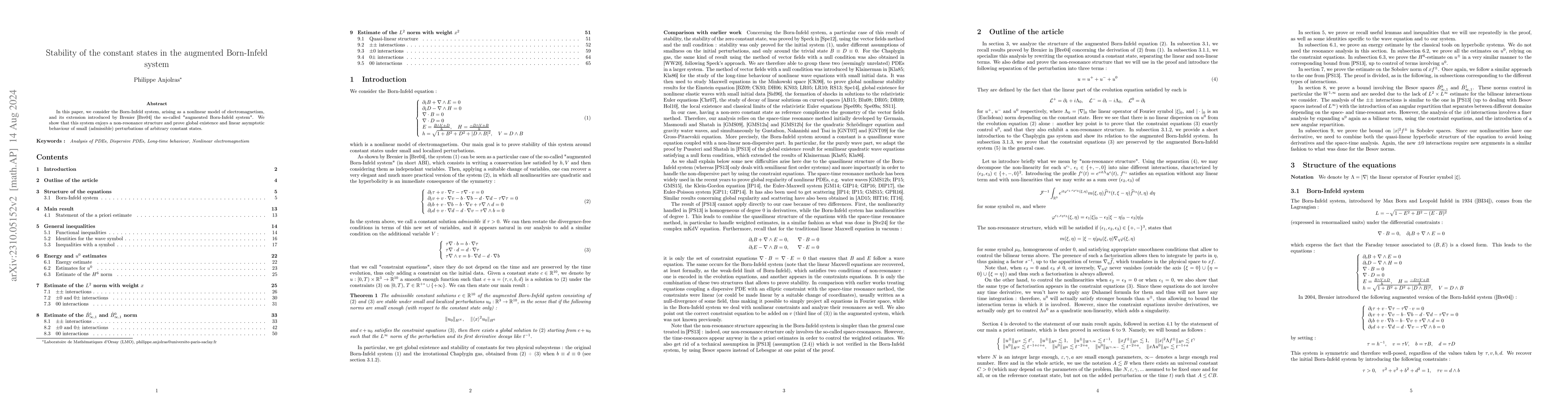 This paper investigates the stability of constant states in the augmented Born-Infeld system, demonstrating its non-resonance structure and proving global existence and linear asymptotic behavior of small perturbations around these states.