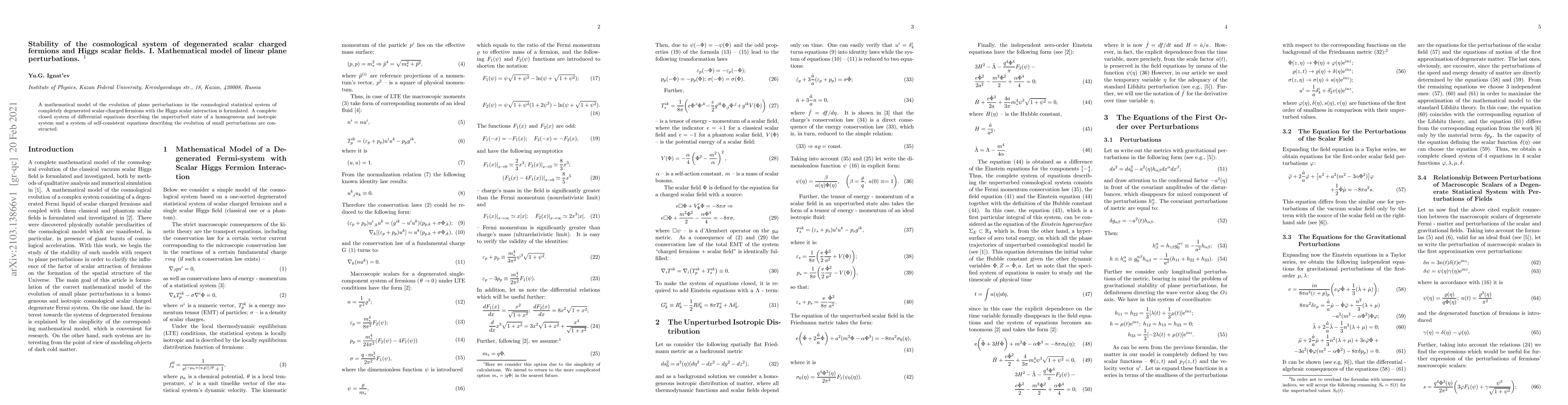 This paper formulates a mathematical model for plane perturbations in a cosmological system of degenerated scalar-charged fermions interacting with Higgs scalar fields. It constructs a closed system of differential equations for both the unperturbed state and the evolution of small perturbations.